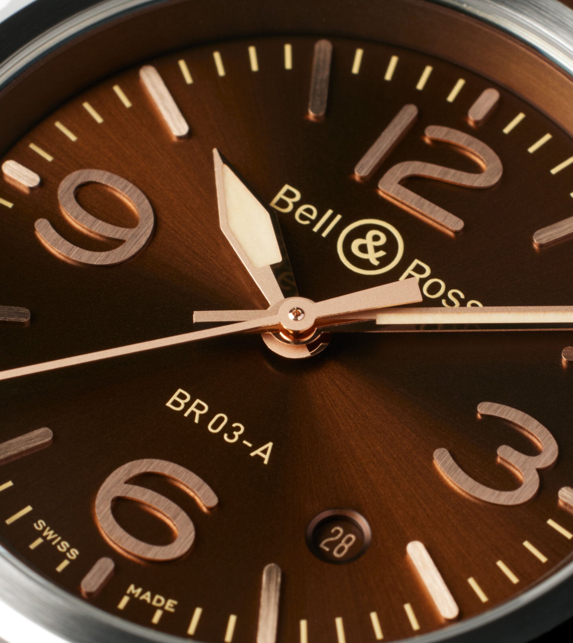 Cadran : Marron soleillé. Chiffres et index en appliques dorées. Aiguilles des heures et des minutes métalliques squelettées remplies de Super-LumiNova®.