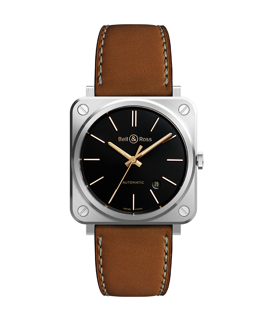 Cadran : Noir soleillé. Chiffres et index en appliques dorés. Aiguilles des heures et des minutes dorées squelettées remplies de Super-LumiNova®.