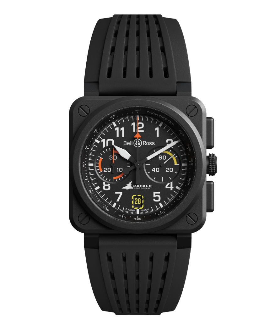 Conçu pour les conditions extrêmes du Rafale Solo Display, le chronographe BR-03 allie robustesse, précision et lisibilité instantanée. Son cadran affiche la silhouette du Rafale et des codes graphiques inspirés des cockpits, comme le pointillé jaune du guichet de date et les aiguilles orangées du chronographe. Index et compteurs photoluminescents assurent une lecture optimale, même dans l’obscurité. Marqué du logo du Rafale Solo Display, ce garde-temps est édité en série limitée à 500 exemplaires.