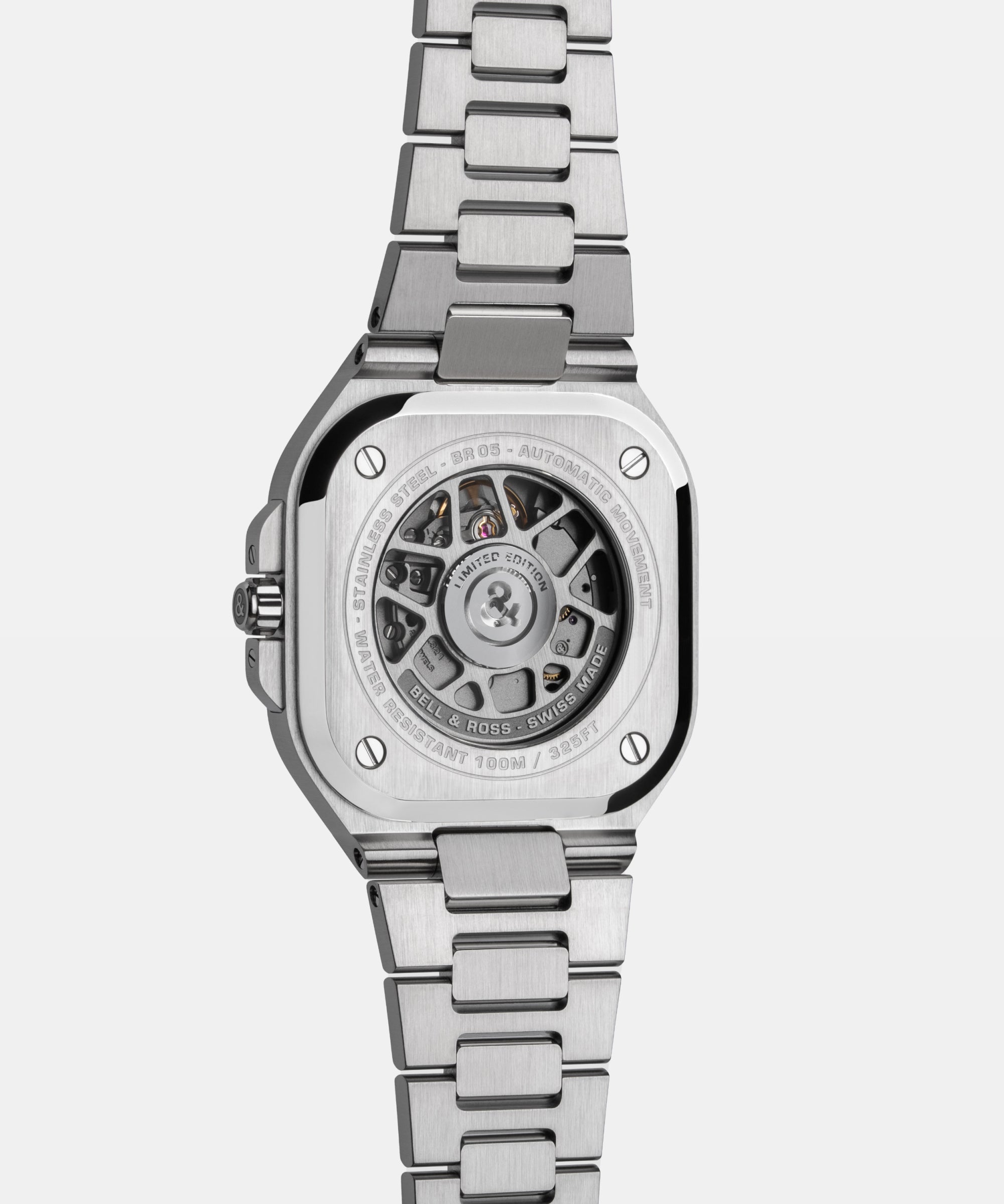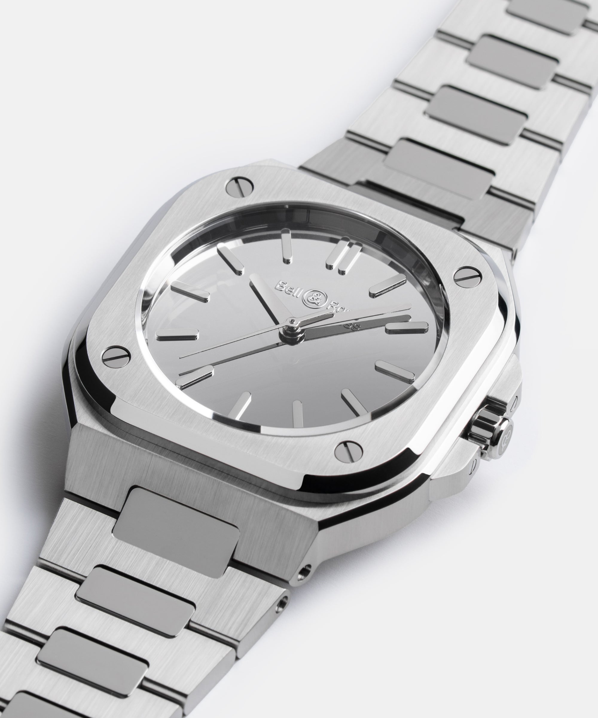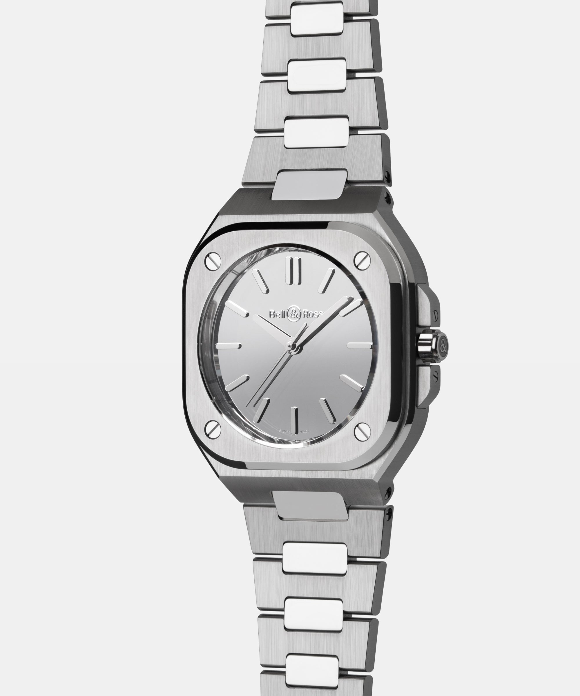 La BR-05 Grey Mirror Steel revisite le bijou de force de Bell & Ross avec un cadran miroir inédit. Édition limitée au design affirmé, elle capte chaque reflet avec une intensité singulière.