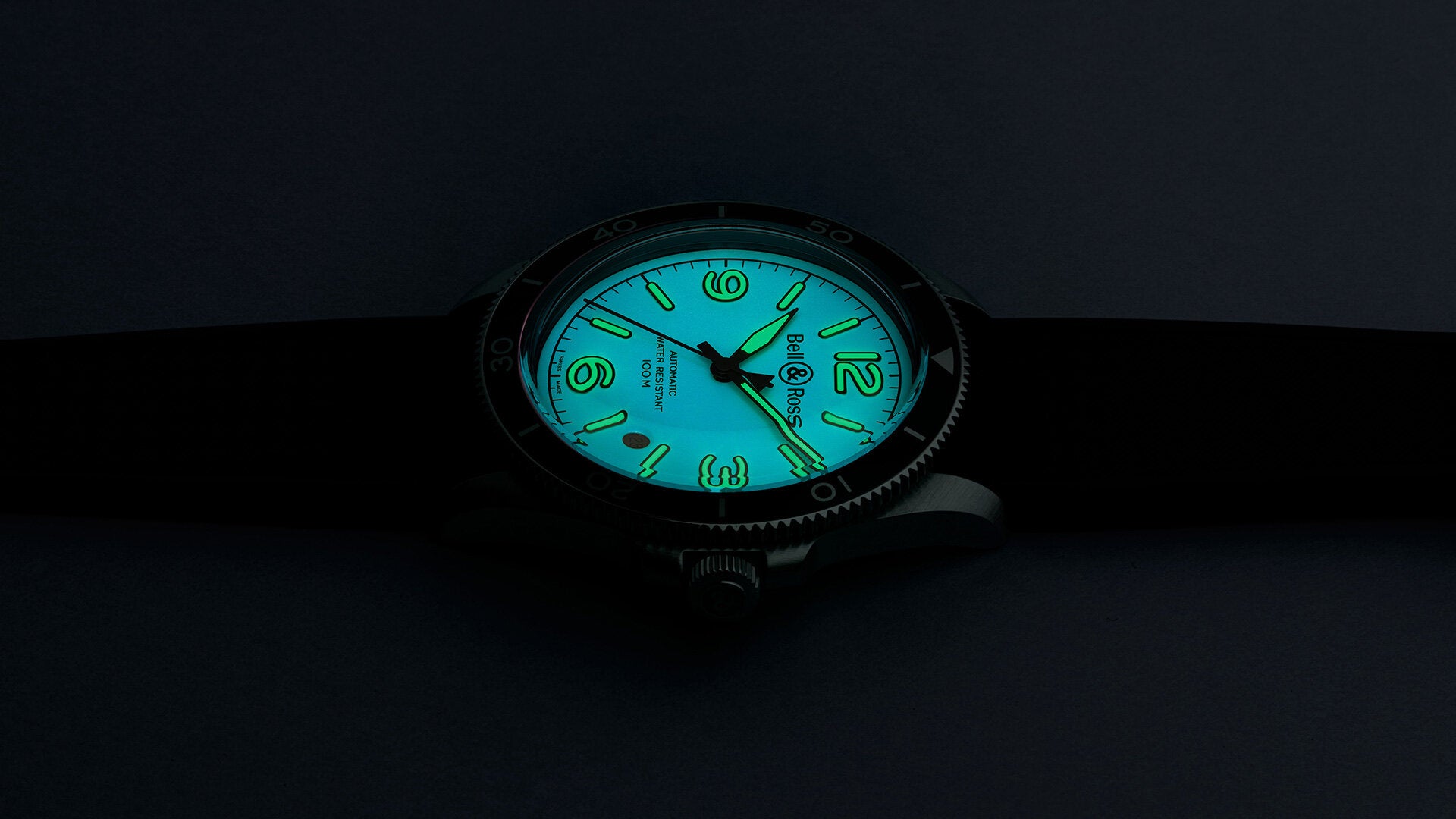 Cadran : Vert luminescent en Super-LumiNova®. Chiffres et index recouverts de Super-LumiNova®. Aiguilles des heures et des minutes remplies de Super-LumiNova®.