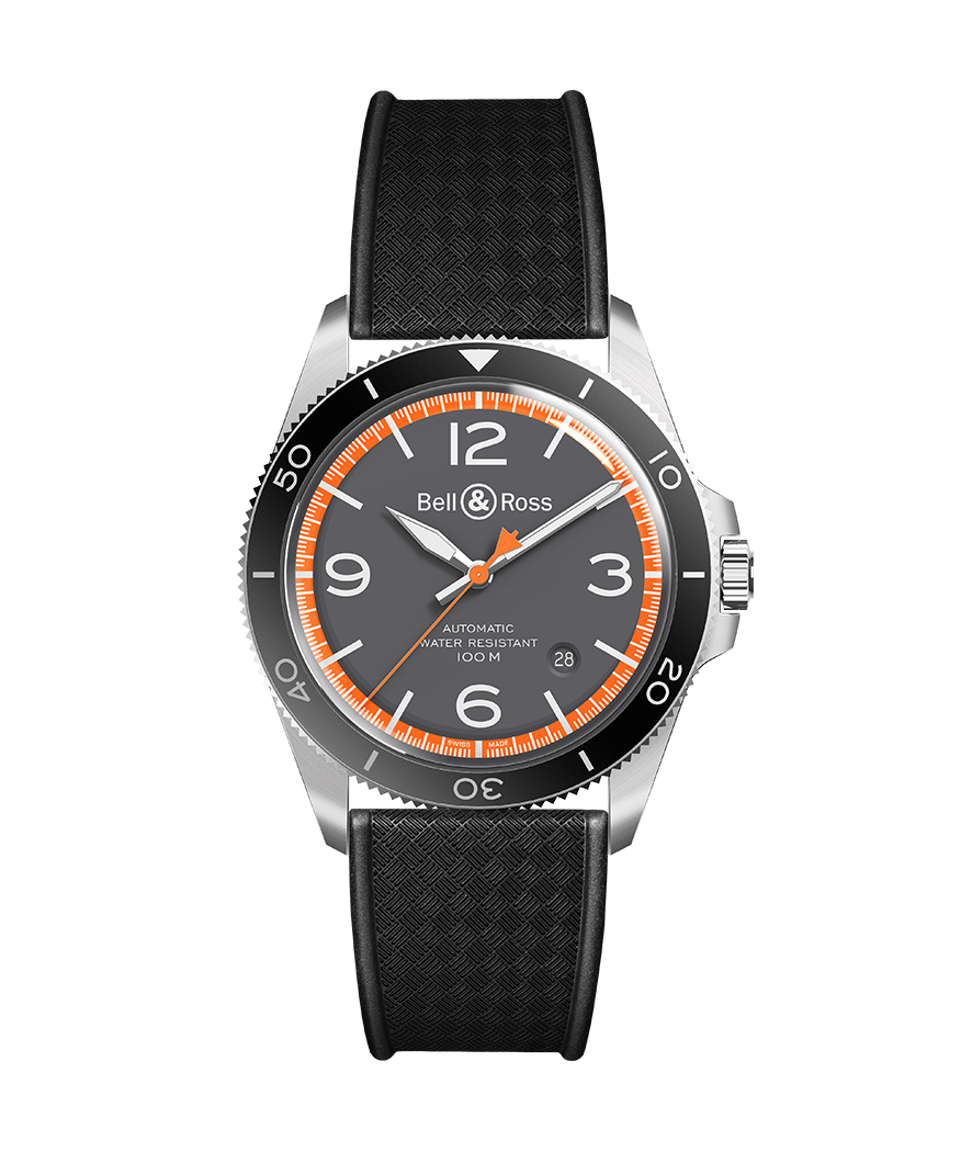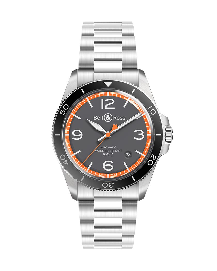 Boîtier : Diamètre 41 mm. Acier poli-satiné. Lunette tournante en acier avec bague en aluminium anodisé noir graduée 60 minutes. Couronne vissée. Fond saphir.
