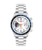 Boîtier : Diamètre 41 mm. Acier poli-satiné. Lunette en acier avec bague en aluminium anodisé bleu graduée avec tachymètre. Couronne et poussoirs vissés. Fond saphir.