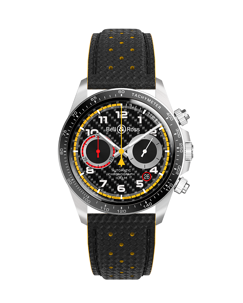Cadran : Fibres de carbonne. Chiffres en appliques remplies de Super-LumiNova®. Aiguilles des heures et des minutes squelettées remplies de Super-LumiNova®.