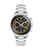 Boîtier : Diamètre 41 mm. Acier poli-satiné. Lunette en acier avec bague en aluminium anodisé noire graduée avec un tachymètre. Couronne et poussoirs vissés. Fond saphir.