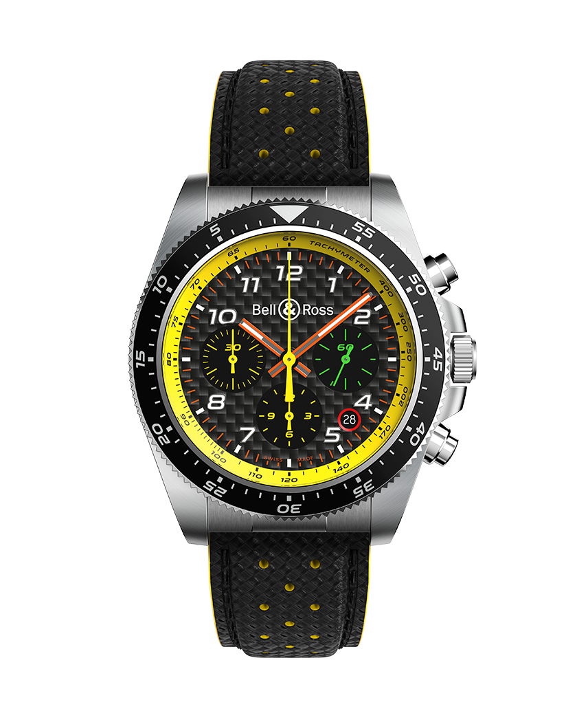 Cadran : Fibres de carbonne. Chiffres en appliques remplies de Super-LumiNova®. Aiguilles des heures et des minutes squelettées remplies de Super-LumiNova®.