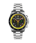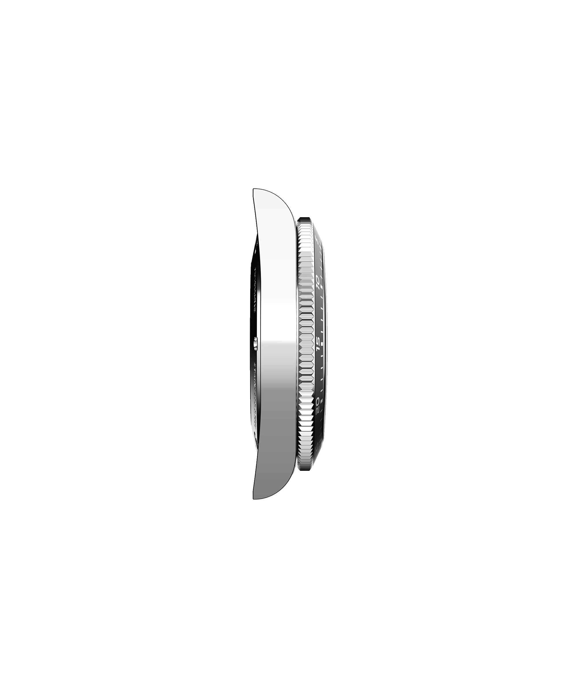 Boîtier : Diamètre 43 mm. Acier poli-satiné. Lunette tournante bi-directionnelle en acier avec bague en aluminium anodisée noire graduée avec un compte à rebours. Couronne vissée. Fond saphir.