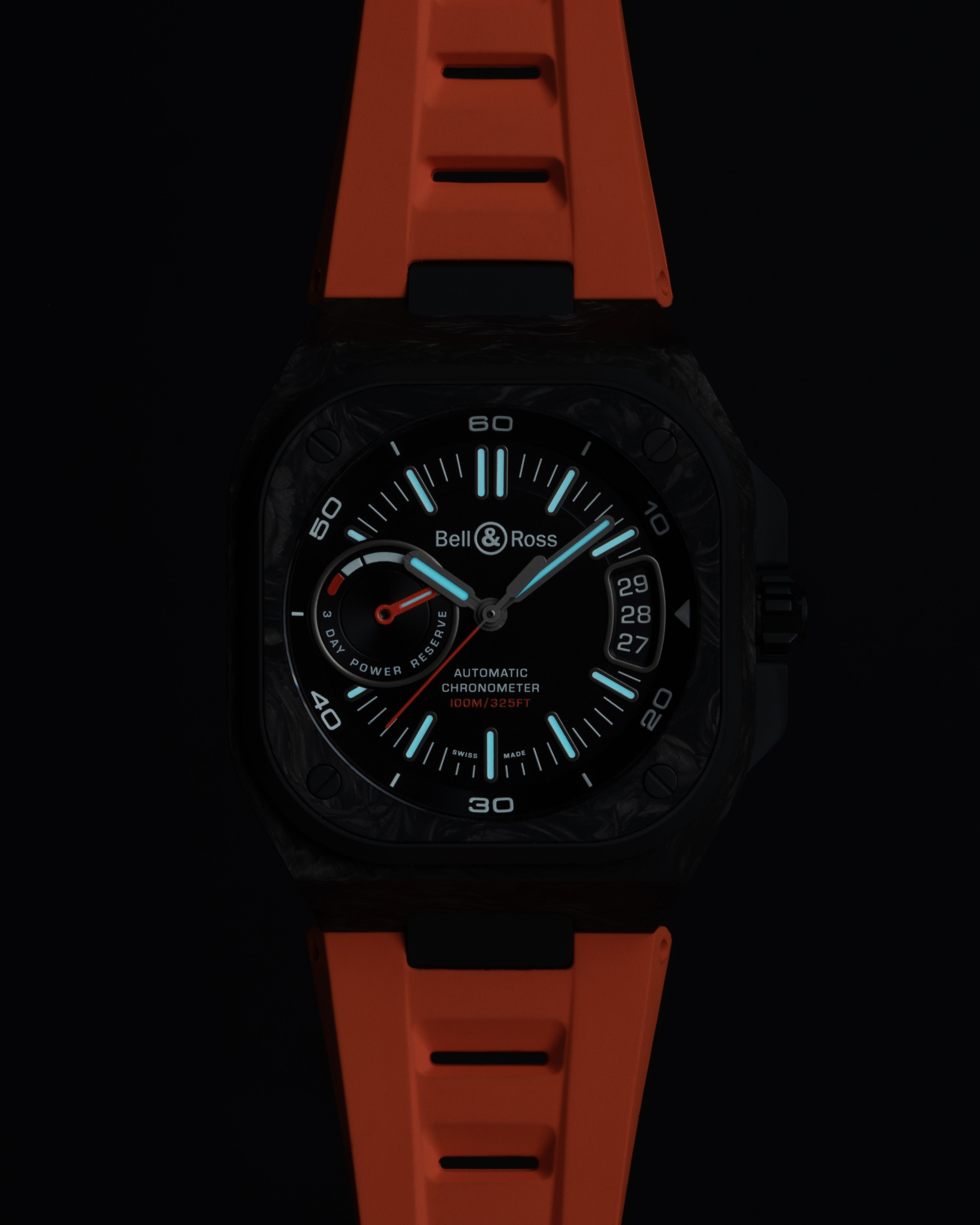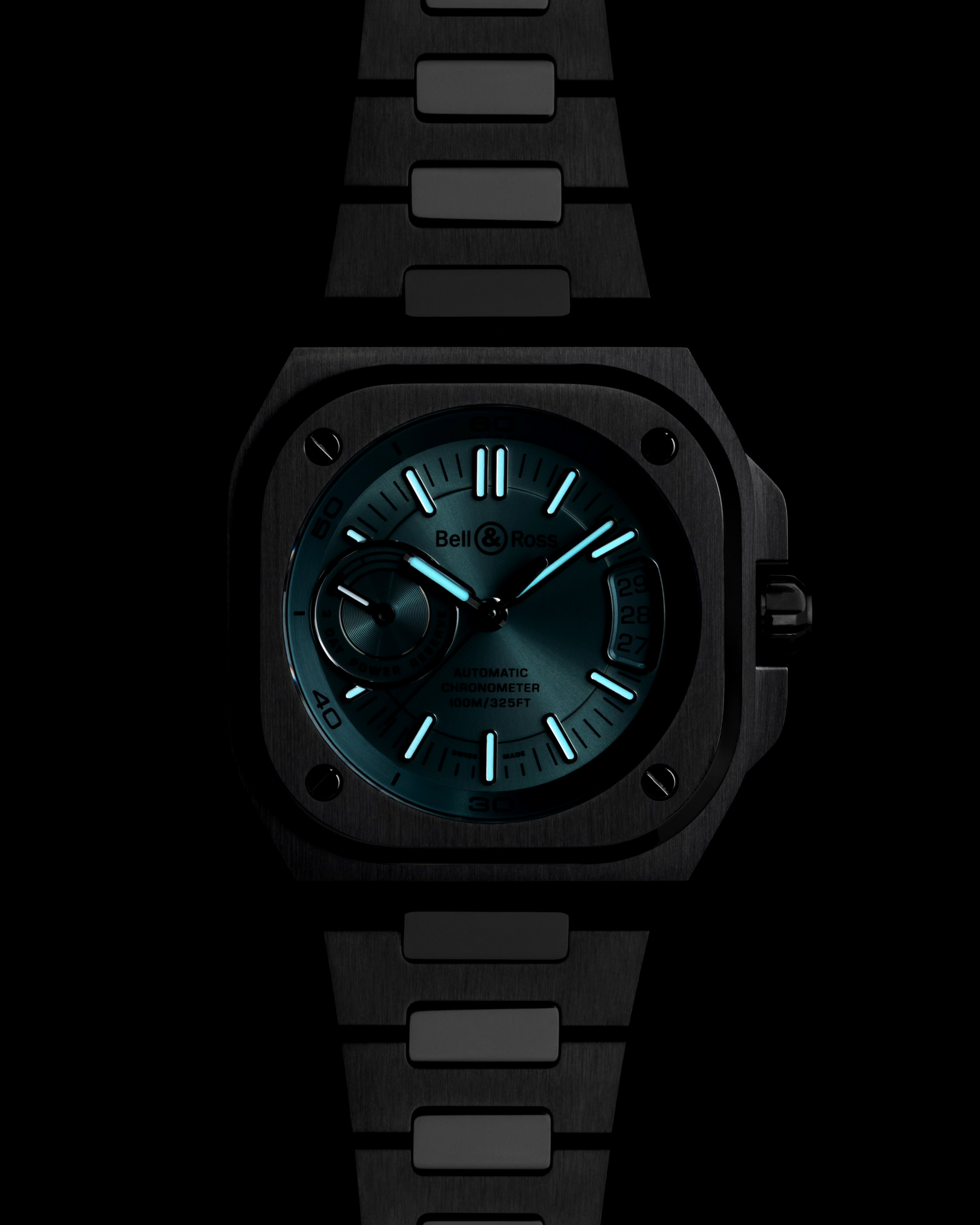 Die BR-X5 zeichnet sich durch ihr irisierendes Zifferblatt aus. Dieser durch kleinste Strukturen und die Brechung des Lichts erzeugte Effekt verleiht jedem Exemplar einen fesselnden, ständig variierenden Look. Der irisierende Effekt ist das Ergebnis einer technischen Verarbeitung mit mehreren dünnen PVD-Schichten in verschiedenen Nuancen, die dazu führt, dass sich die Farbe des Zifferblatts je nach Beleuchtung und Neigung verändert.