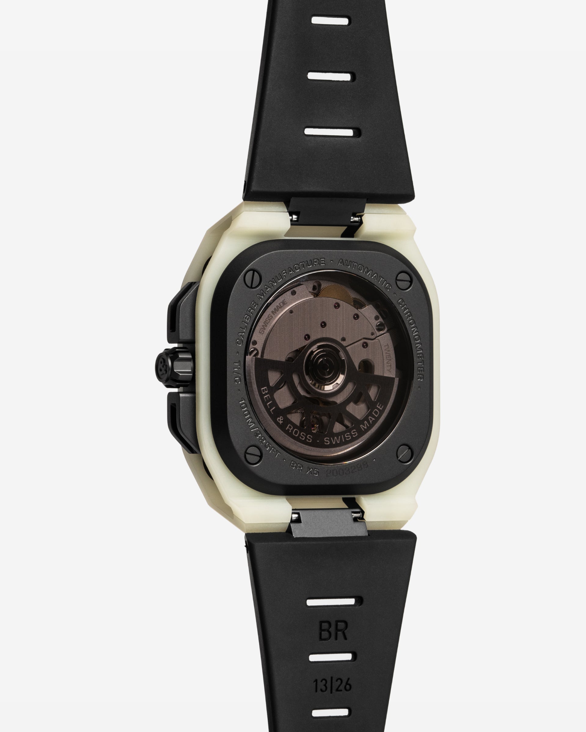 Die BR-X5 integriert ein Manufakturwerk in die permanente Kollektion. Das Kaliber BR-CAL.323 mit einer Gangreserve von 70 Stunden ist durch einen breiten Saphirglasboden sichtbar. Die Uhr ist von der COSC zertifiziert und erfüllt somit die höchsten Anforderungen an die Präzision bei der Zeitmessung. Für Uhrwerk und Gehäuse gilt eine Garantie von 5 Jahren.