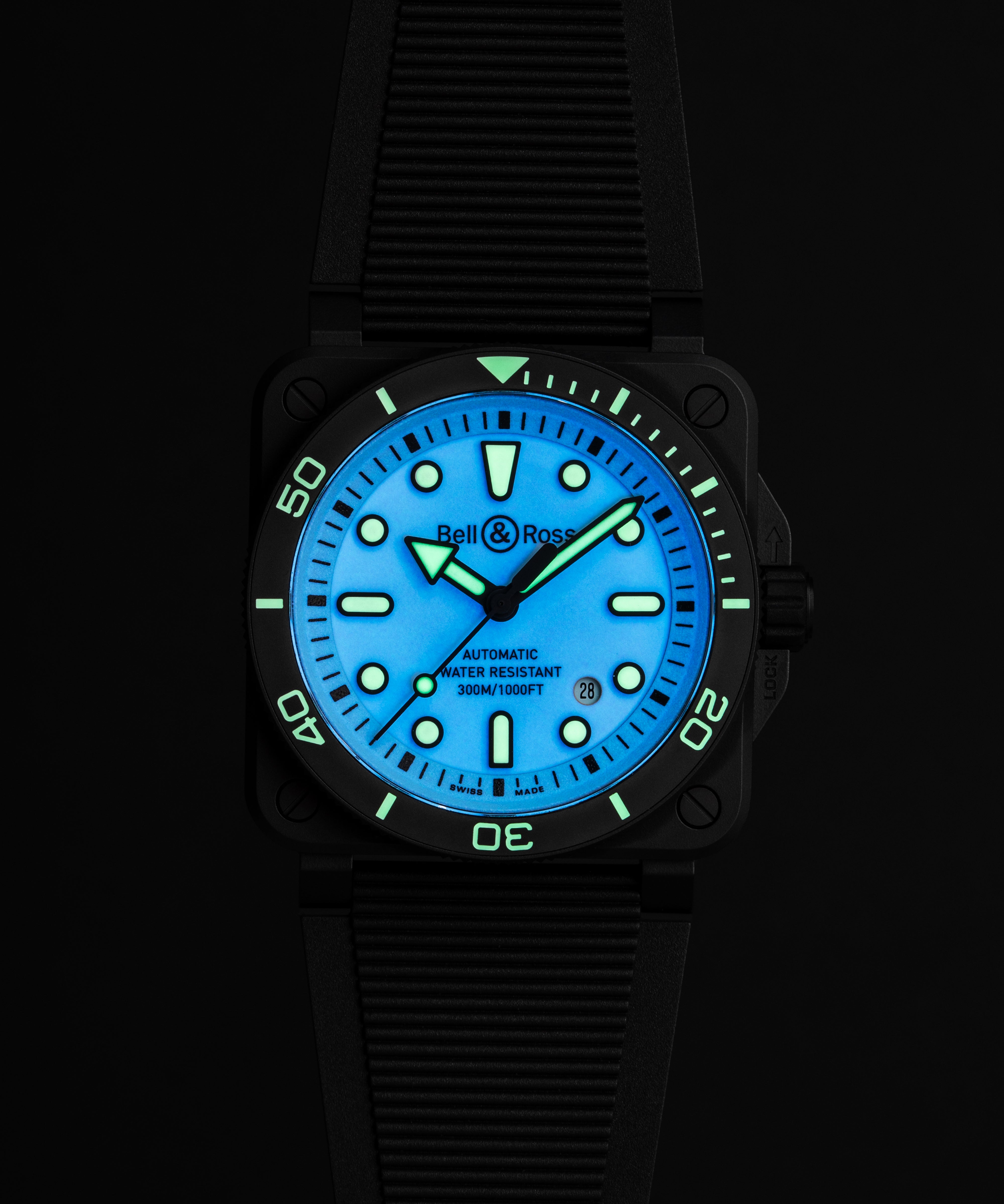Die neue Version der BR-03 Diver Full Lum besticht mit einem Zifferblatt aus blassblauer Super-LumiNova sowie Indizes und Zeigern aus weißer Super-LumiNova. Diese Uhr ist künftig Teil der permanenten Linie der BR-03 Diver und vereint gekonnt Leistung und Unverwechselbarkeit.