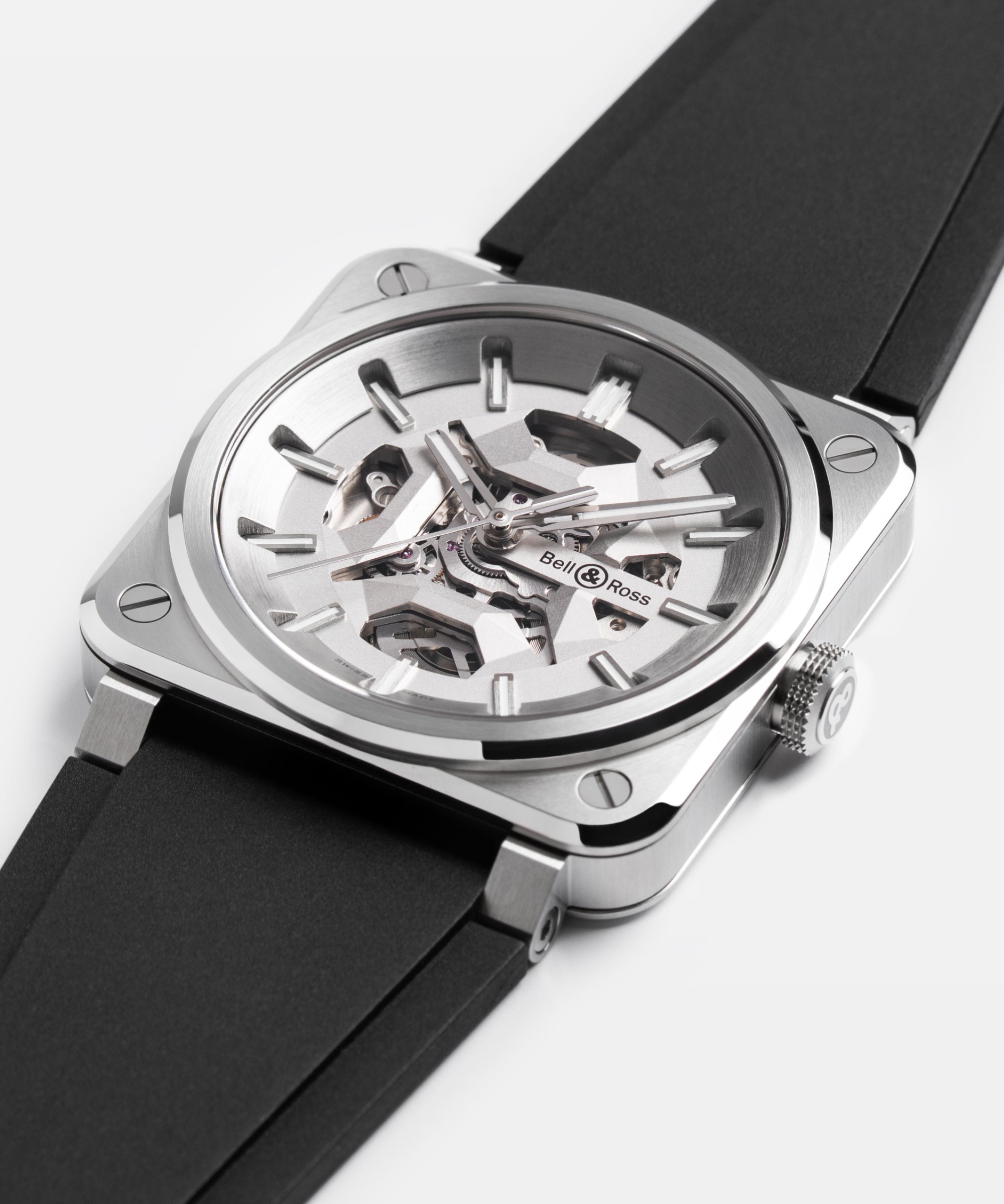 Das neue, in X-Form skelettierte Uhrwerk, das Kaliber BR-CAL.328 mit einer Gangreserve von 54 Stunden, das von Bell & Ross entwickelt und exklusiv für Bell & Ross hergestellt wird, vereint meisterhafte Uhrmacherkunst mit vollendetem Design.