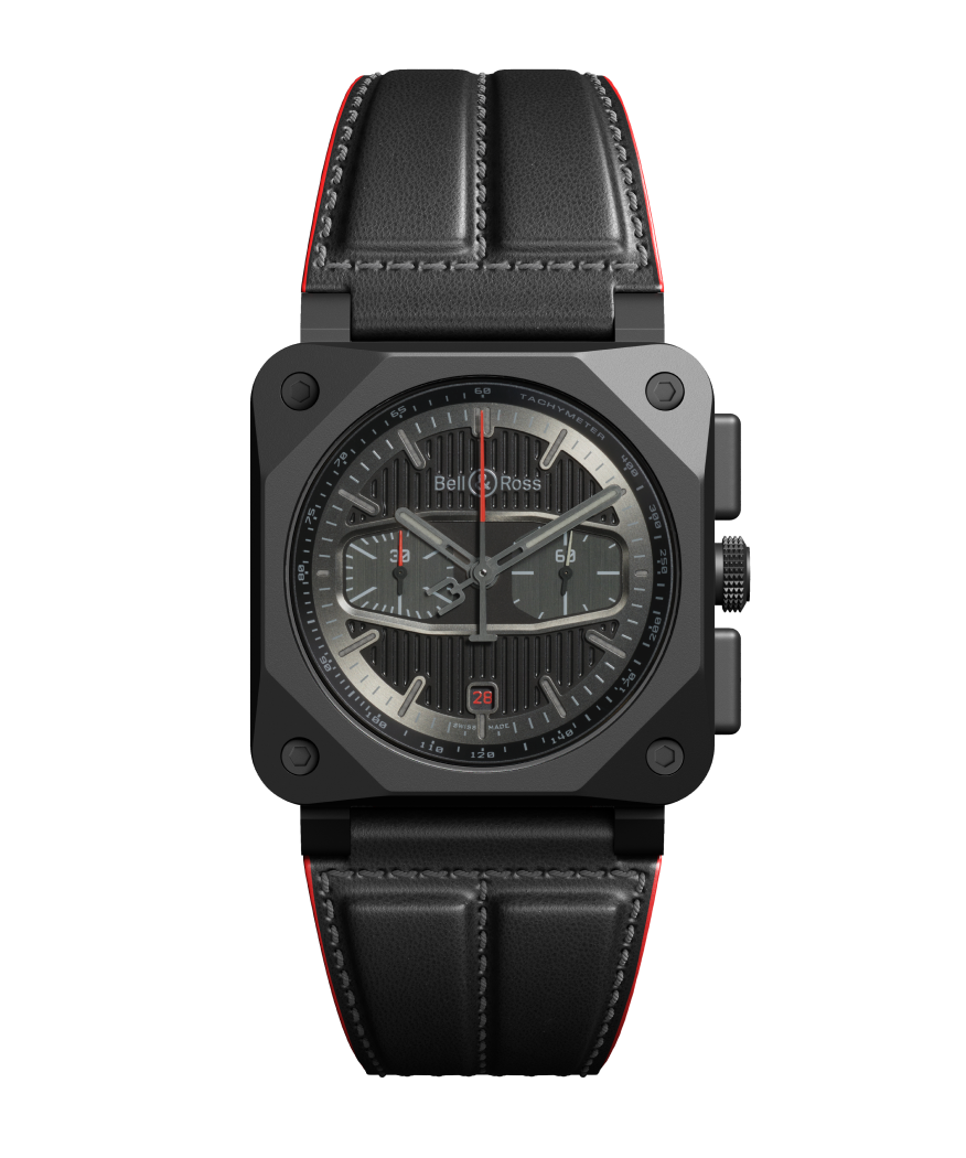 Der Bell & Ross BR-03 Chrono BLACKTRACK Chronograph, inspiriert vom BT-06 Motorrad, das in Zusammenarbeit mit dem Designer Sacha Lakic entworfen wurde, bezieht sich auf die technische Konstruktion von Stealth-Flugzeugen.