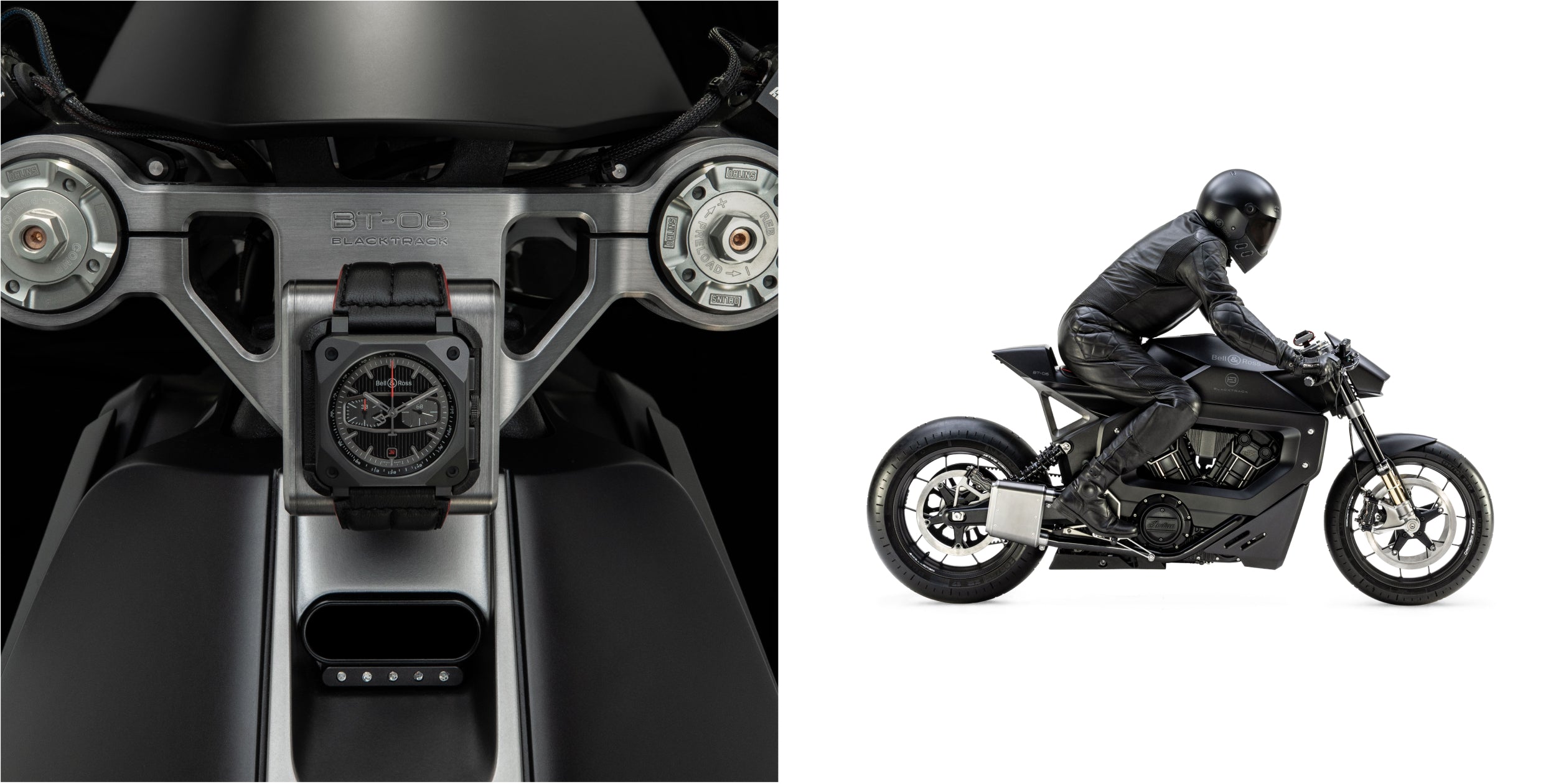 Die von den avantgardistischen Linien eines Tarnkappenflugzeugs inspirierte Chronographenuhr BR-03 Chrono Blacktrack passt perfekt zu dem in Zusammenarbeit mit Designer Sacha Lakic entwickelten Motorrad Blacktrack BT-06. Die Uhr und das Motorrad wurden gleichzeitig entworfen und haben sich gegenseitig inspiriert, so dass zwei außergewöhnliche Objekte entstanden sind. Das Blacktrack BT-06, ein Cafe Racer mit einem indischen 1200-ccm-Motor, bringt es auf 100 PS. Getreu der Blacktrack-DNA integriert es auch Elemente aus der Haute Horlogerie. So spiegelt die Seitenverkleidung das Design des Uhrengehäuses von Bell & Ross und seine vier ikonischen Schrauben wider.
