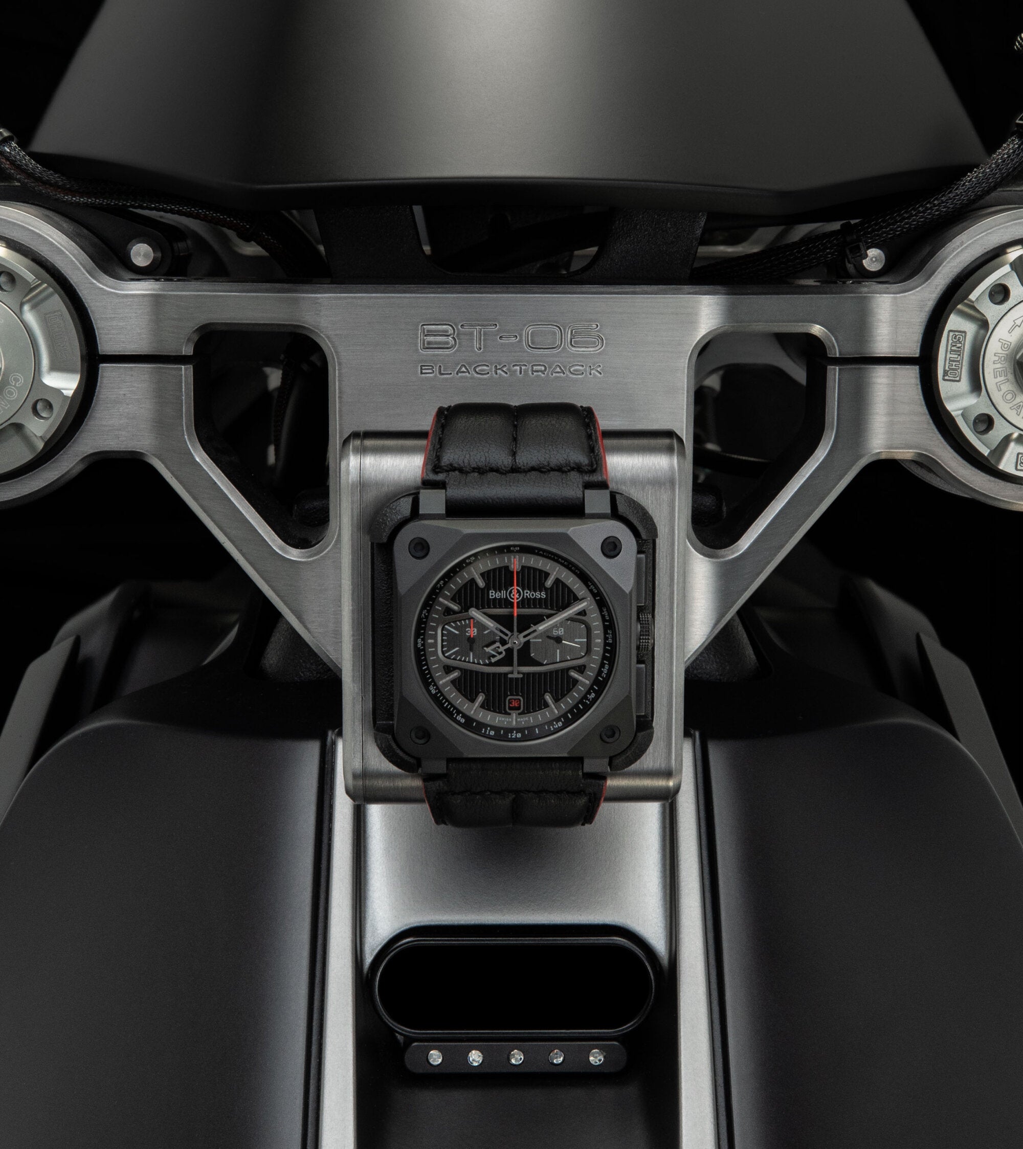 Der Bell & Ross BR-03 Chrono BLACKTRACK Chronograph, inspiriert vom BT-06 Motorrad, das in Zusammenarbeit mit dem Designer Sacha Lakic entworfen wurde, bezieht sich auf die technische Konstruktion von Stealth-Flugzeugen.