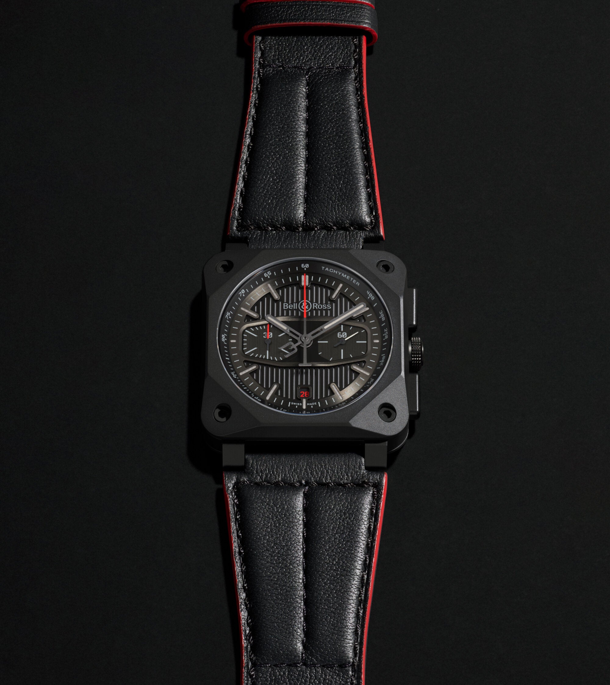 Bikern fällt sofort das vom Motorrad inspirierte schwarze Kalbslederarmband auf, das mit einer roten Kante gesäumt und mit hochwiderstandsfähigem technischem Material ausgekleidet ist. Das Armband wird mit einer Dornschließe aus Stahl mit schwarzer PVD-Beschichtung geschlossen, während die Steppung auf dem Armband selbst eine Anspielung auf die Motorradsatteldecken und die Anzüge der Fahrer ist.