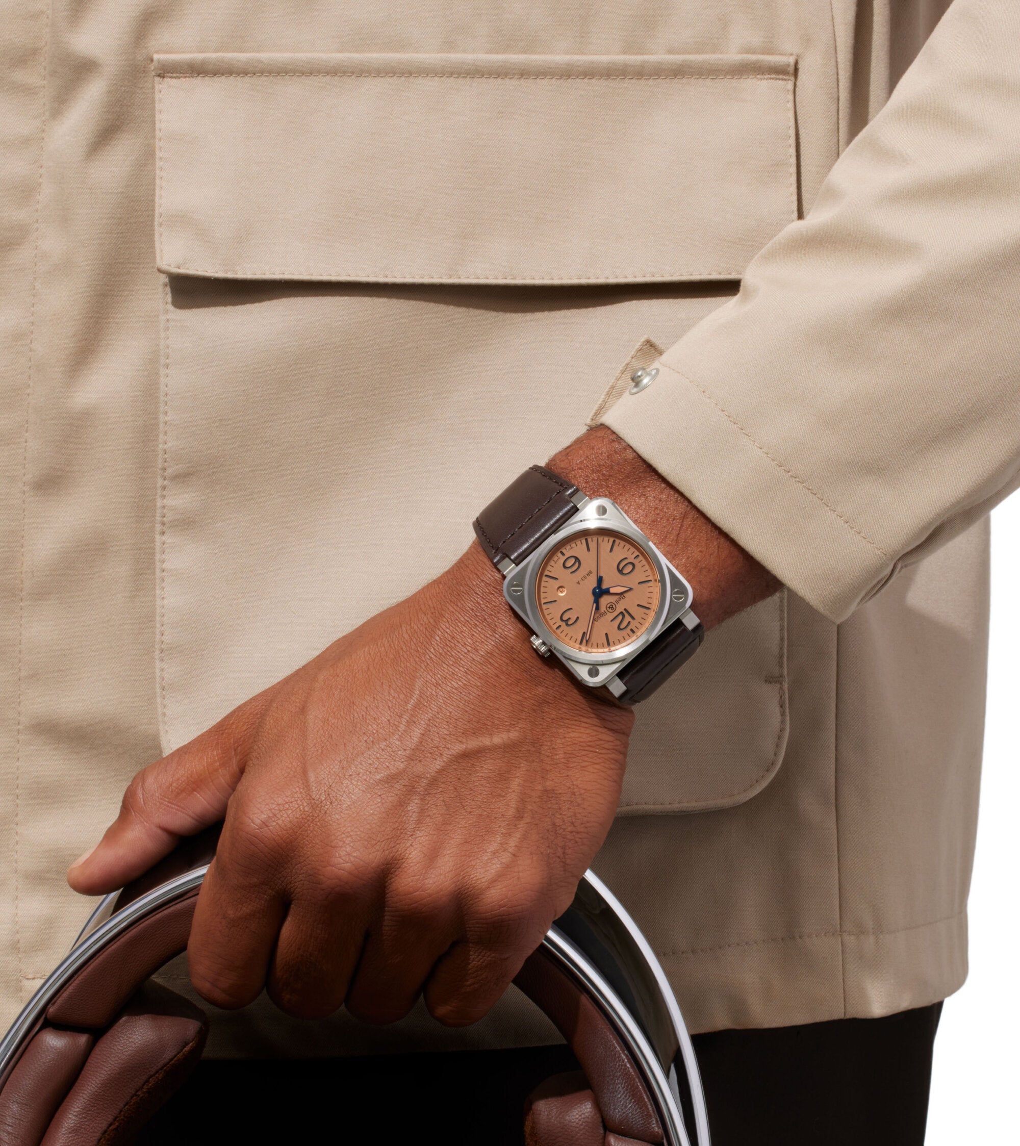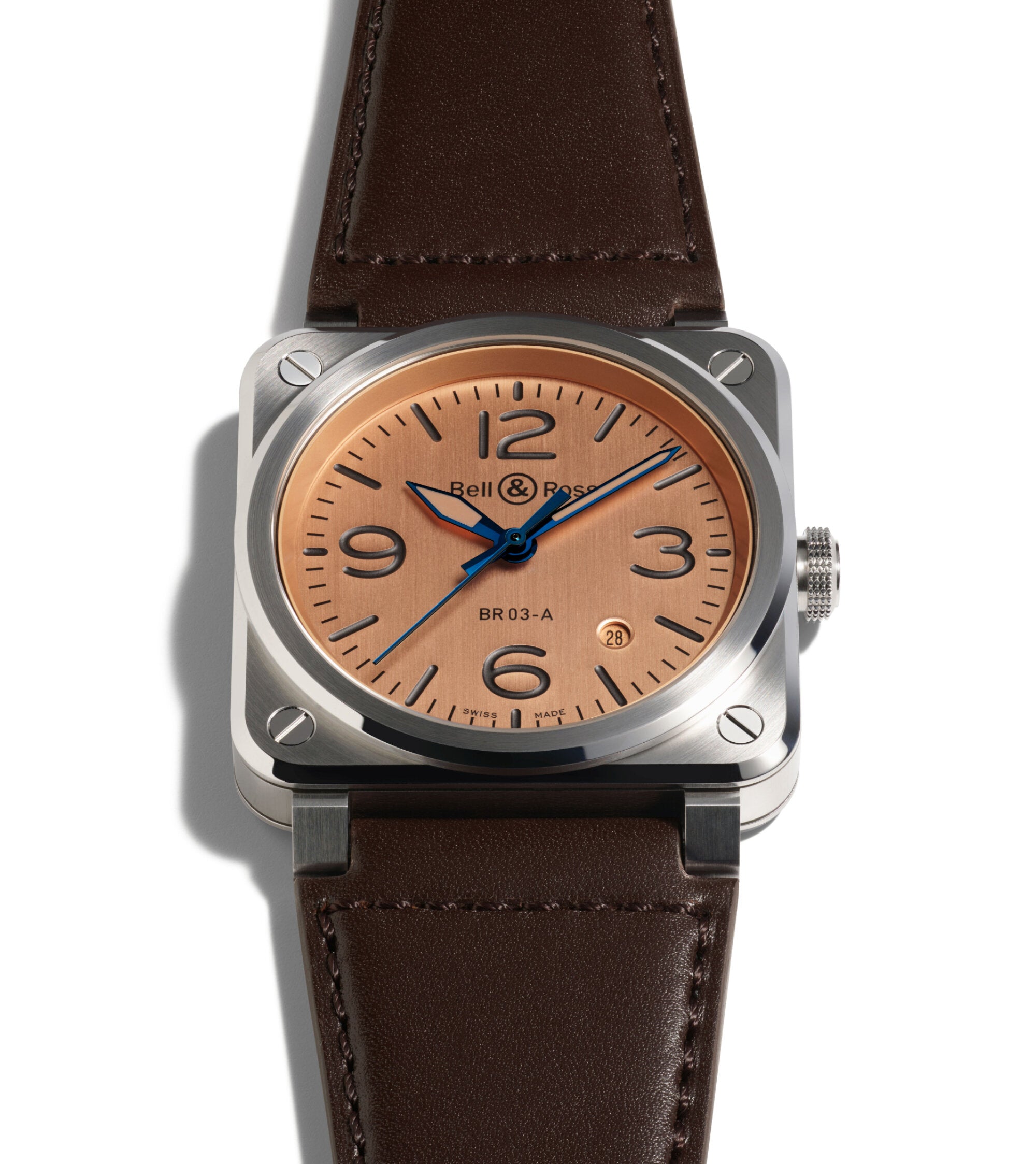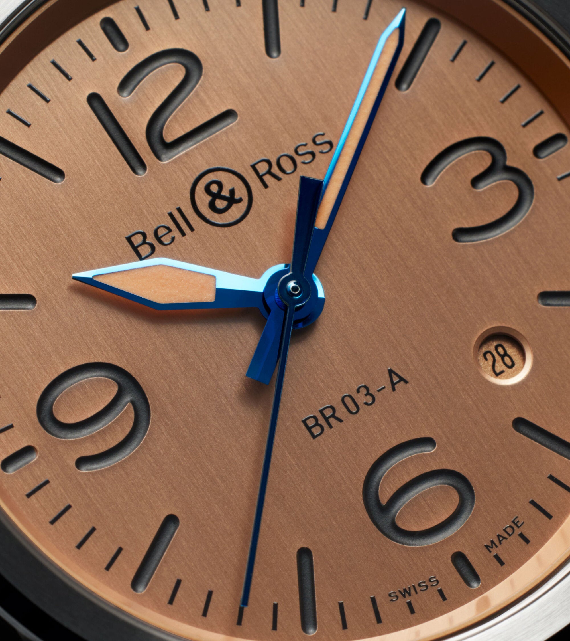Die BR-03 Copper präsentiert ein verführerisches, galvanisiertes Kupferzifferblatt, das durch gravierte und schwarz lackierte Ziffern und Indizes eine subtile Tiefenwirkung erhält. Das Zifferblatt wird durch zwei metallisch blaue Zeiger ergänzt, die dieser Version der BR03 einen ultramodernen Retro-Touch verleihen.