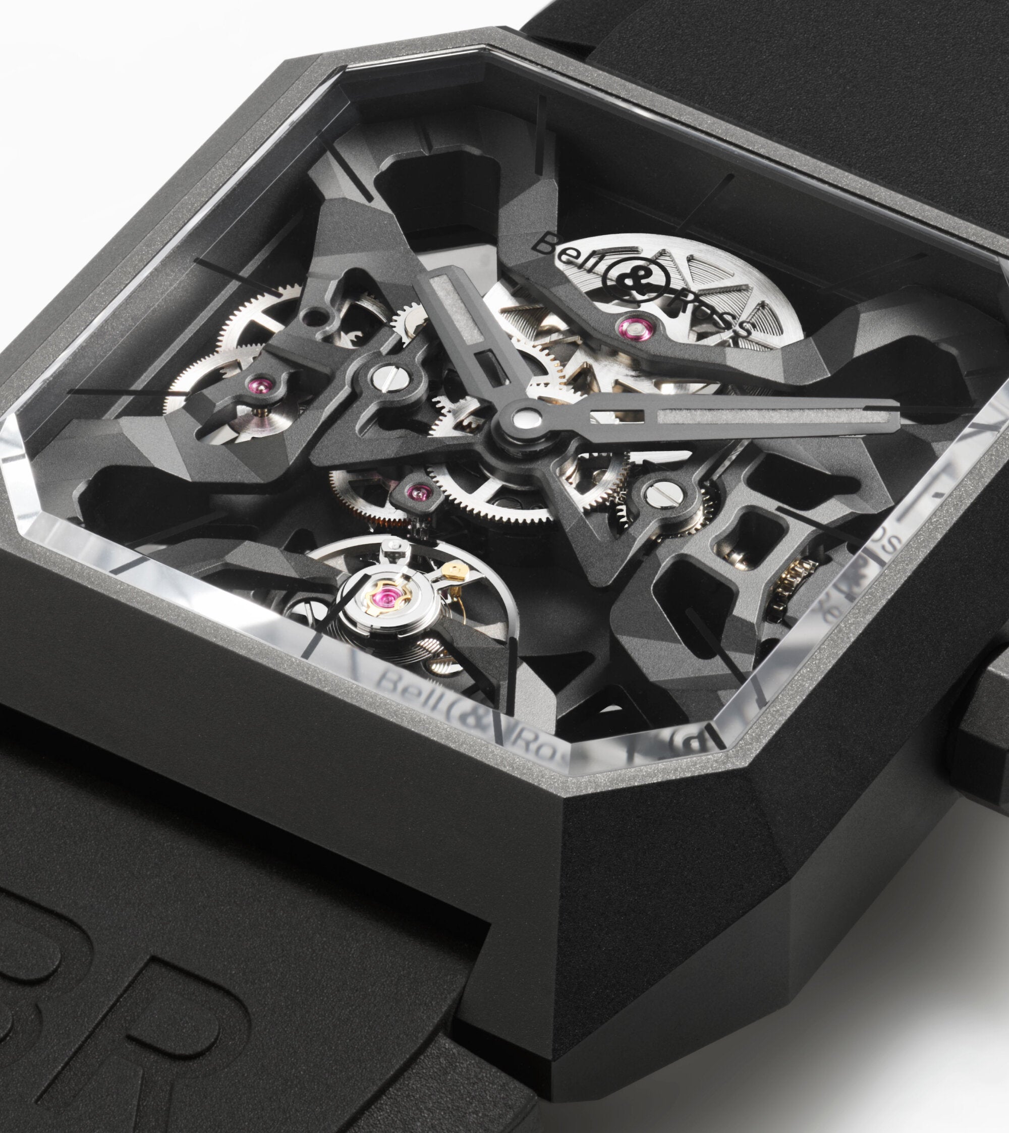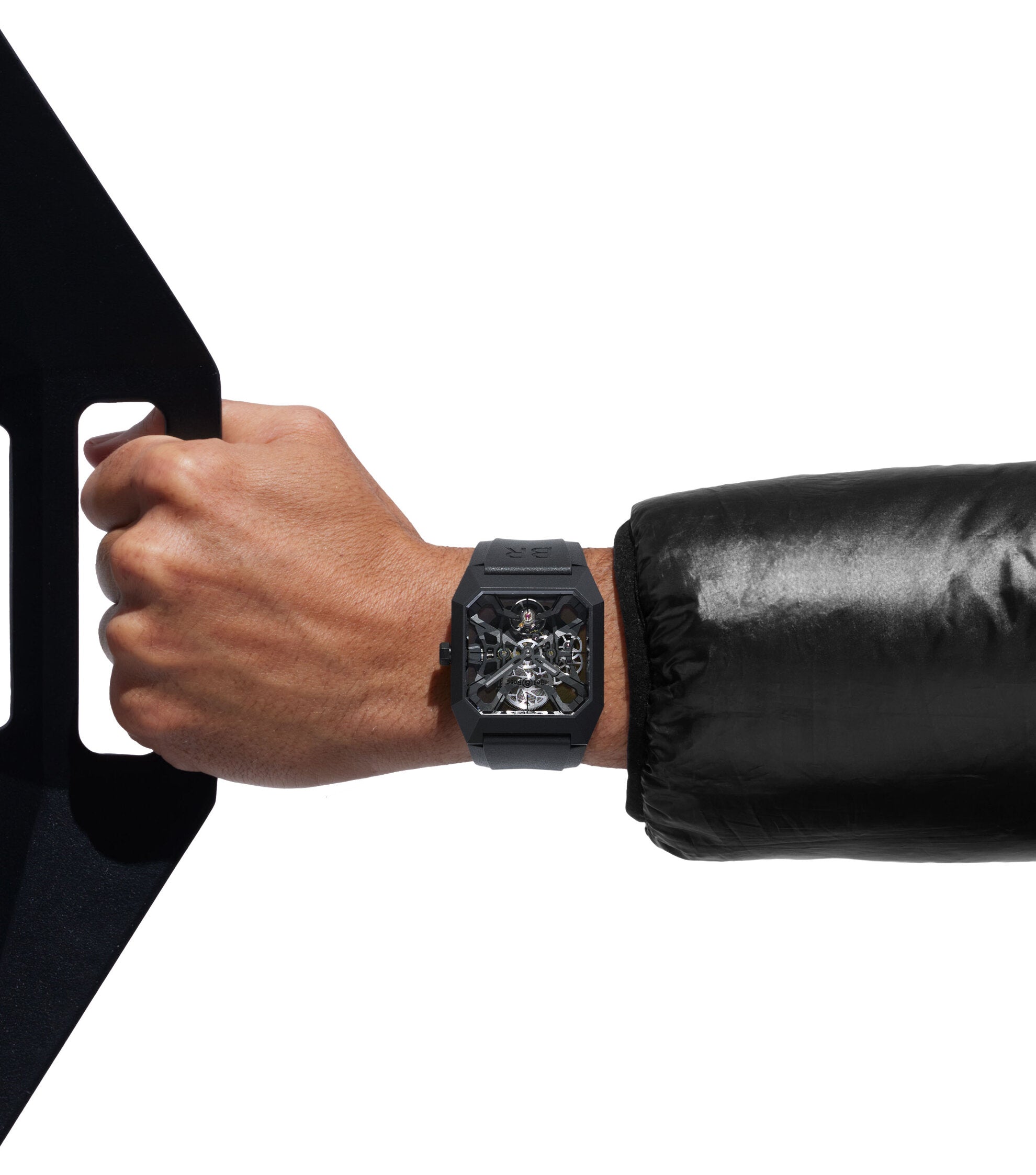 Die Hauptbestandteile des Uhrwerks sind durchbrochen gearbeitet, was das Konzept der zurückhaltenden Unsichtbarkeit noch weiter führt. Auch das Kaliber BR-CAL.383 wurde dank der 3D-Skelettierung spektakulär überarbeitet.