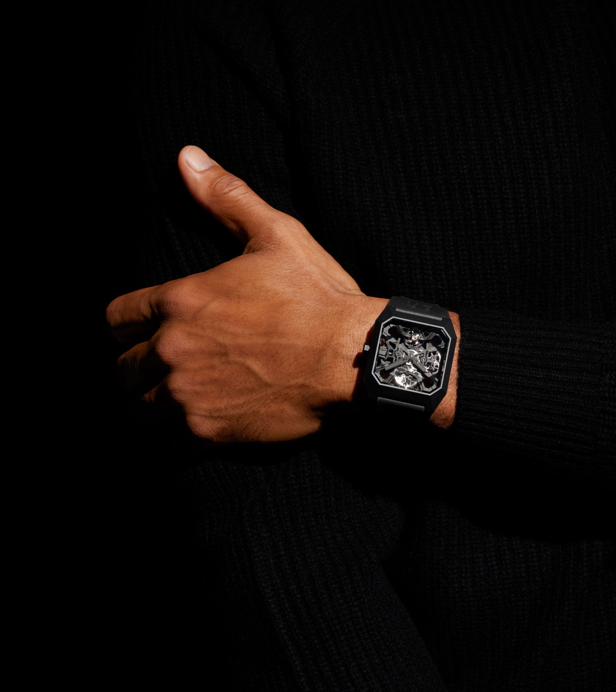 Für ein puristisches Design wurde auf die Bandanstöße verzichtet und die Aufnahme für das Kautschukarmband direkt aus dem Gehäuse ausgeschnitten. Dank einem Schliff mit Diamantpulver wurden die Facetten überarbeitet und die Volumen betont.
