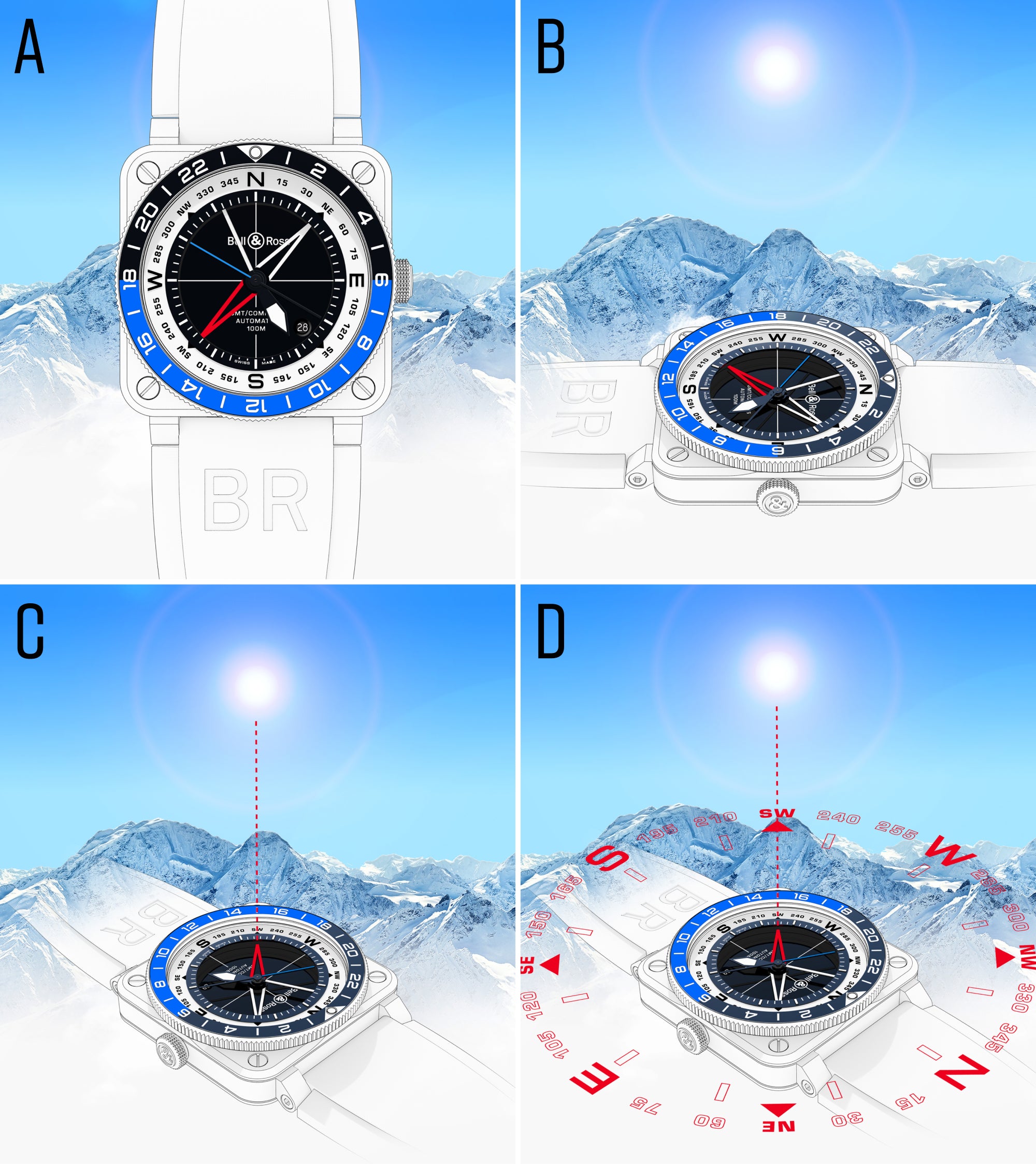 Das Zifferblatt der BR-03 GMT Compass verwandelt sich in einen Sonnenkompass: Die Skalierung auf dem Höhenring umspannt einen vollständigen Kreis von 360° und der rautenförmige GMT-Zeiger ermöglicht die Orientierung mithilfe der Sonne. Die vier auf die Lünette gravierten Himmelsrichtungen und die 24-Stunden-Anzeige machen diesen Zeitmesser zu einem echten Navigationsinstrument.