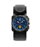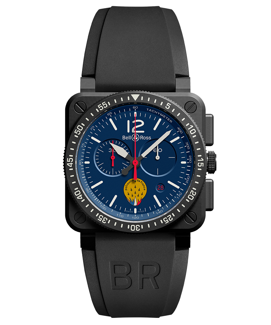 Stück wird diese limitierte Edition der Öffentlichkeit zugänglich gemacht. Das Zifferblatt der BR 03-94 PATROUILLE DE FRANCE trägt mit Stolz und Eleganz das Abzeichen der Patrouille de France. Der Kreis steht für den Zusammenhalt der Einsatzeinheit und ihre Fähigkeit, alle Aspekte einer Situation zu bewältigen. Das Gold auf dem Hintergrund des Emblems ist eine Farbe, die häufig in militärischen Abzeichen verwendet wird. Die neun Jet-Silhouetten erinnern an neun Fouga Magister (die früheren Flugzeuge der Patrouille de France vor dem Alpha-Jet) und repräsentieren ihre charakteristische Flugschau-Formation, die auch als “Concorde” bekannt ist. Das dreifarbige Banner, das das Logo umhüllt, symbolisiert den französischen Farbnebel und die akrobatischen Evolutionen des fliegenden Teams, dem “Botschafter” der französischen Luftund Raumfahrtkräfte. Dieses Emblem ist mehr als nur ein Logo, es hat einen hohen Symbolgehalt und steht für die Werte, die die Piloten verkörpern: Genauigkeit, Zuverlässigkeit, Disziplin, Kontrolle, aber auch Solidarität und Demut. Durch die Partnerschaft mit der Patrouille de France assoziiert sich Bell & Ross mit diesen Werten und schließt sich ihnen als Botschafter für Exzellenz in der französischen Luftfahrt an. Das Logo der Patrouille de France ist unten auf dem Zifferblatt aufgedruckt und auch auf dem Gehäuseboden eingraviert.