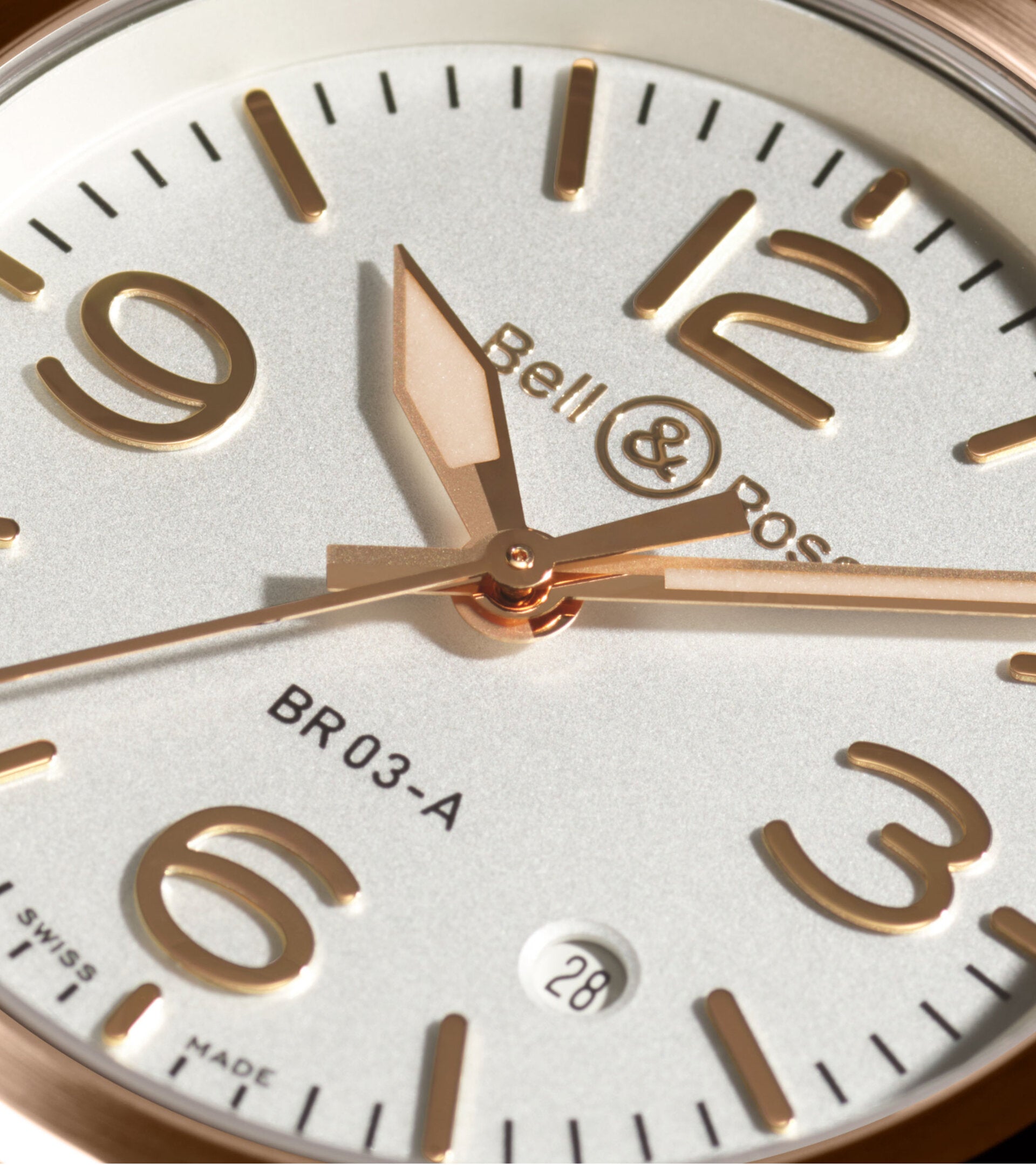 Auch in dieser eleganten Ausführung bleibt die BR-03 ihrer Aufgabe als Uhr treu. Bell & Ross behält seine Standards hinsichtlich der Funktionalität ganz in der Tradition der Luftfahrt bei. Die applizierten, mit 18-karätigem Roségold vergoldete Indizes und Ziffern sowie die skelettierten Zeiger sind mit Super-LumiNova® gefüllt, so dass im Dunkeln hervorragende Lesbarkeit gewährleistet ist. Das entspiegelte Saphirglas sorgt für klare Sichtbarkeit wie durch die Cockpitscheibe eines Kampfflugzeugs.