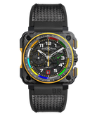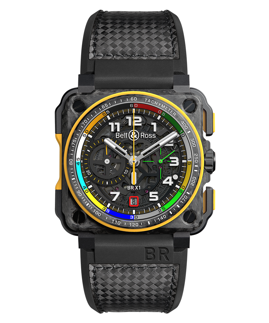 Gehäuse : Breite 45 mm. Geschmiedetes Carbon® und Keramik mit Gummieinsätzen. Drücker. Gehäuseboden mit getönter Saphirglasöffnung, zentriert über der Unruh.