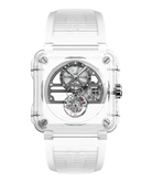 Neben ihrer herausragenden uhrmacherischen Leistung ist es vor allem das Saphirglas, das der BR-X1 SKELETON TOURBILLON SAPPHIRE ihre Seltenheit und Schönheit verleiht. Das Saphirgehäuse wirkt wie ein Röntgenbild: Es ermöglicht, die Gehäusestruktur zu visualisieren und die Montage besser zu verstehen, während der Blick gleichzeitig frei in das Herzstück der Uhr und ihr Uhrwerk schweift. Indem es die Seele dieses einzigartigen Zeitmessers offenbart, wird das Schauspiel wahrhaft magisch.