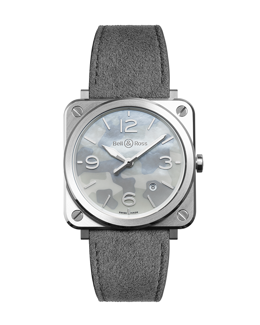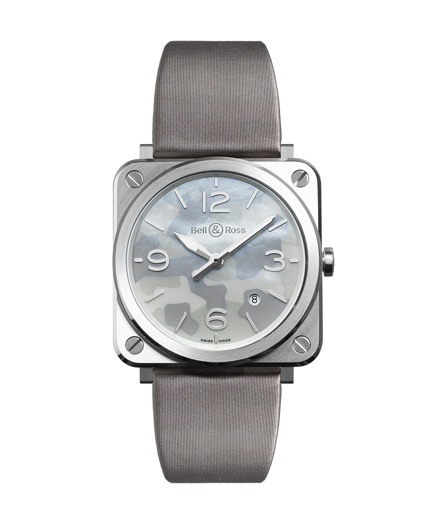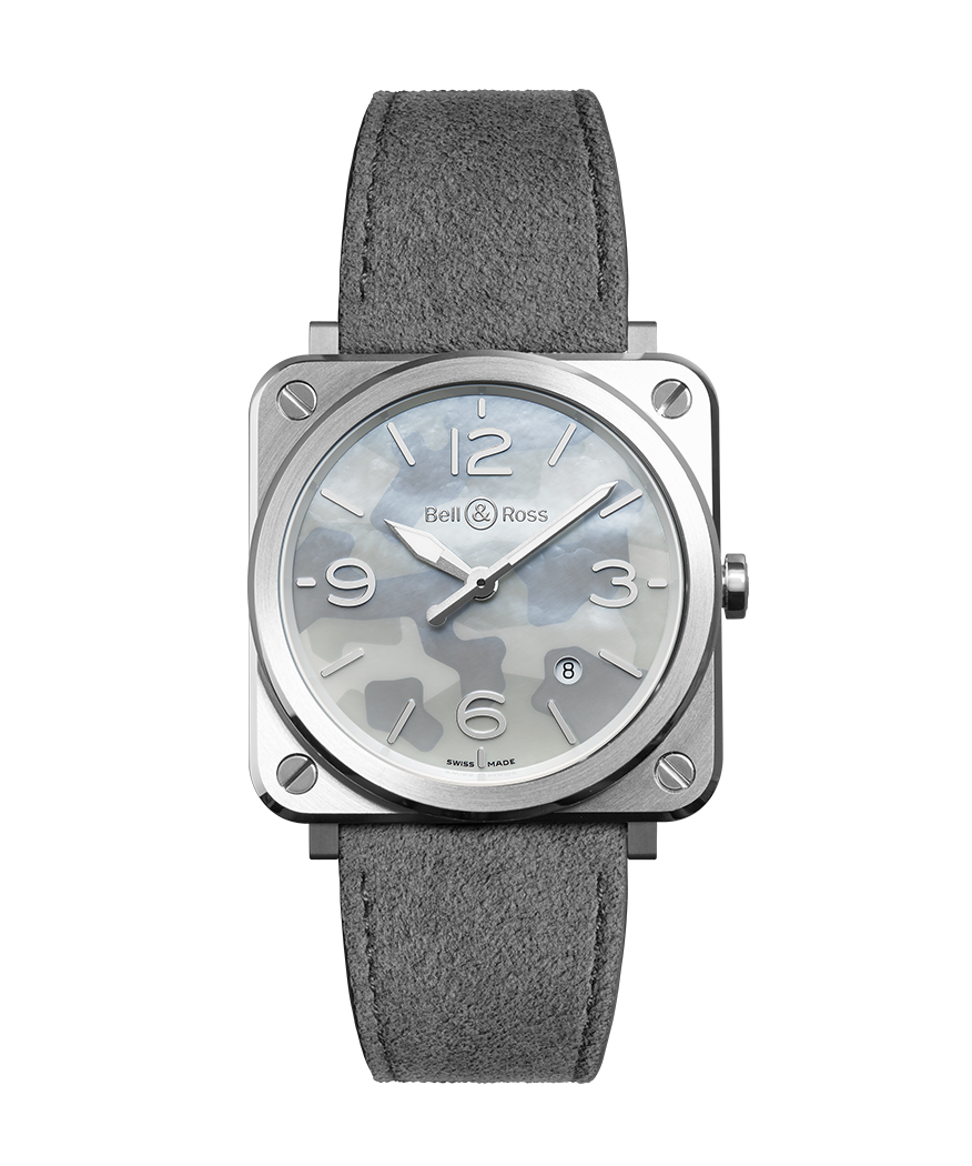 Zifferblatt : Graues Perlmutt-Zifferblatt mit Tarnmuster. Aufgesetzte Ziffern und Indizes aus Metall. Skelettierte Stunden- und Minutenzeiger aus Metall mit Super-LumiNova®-Füllung.