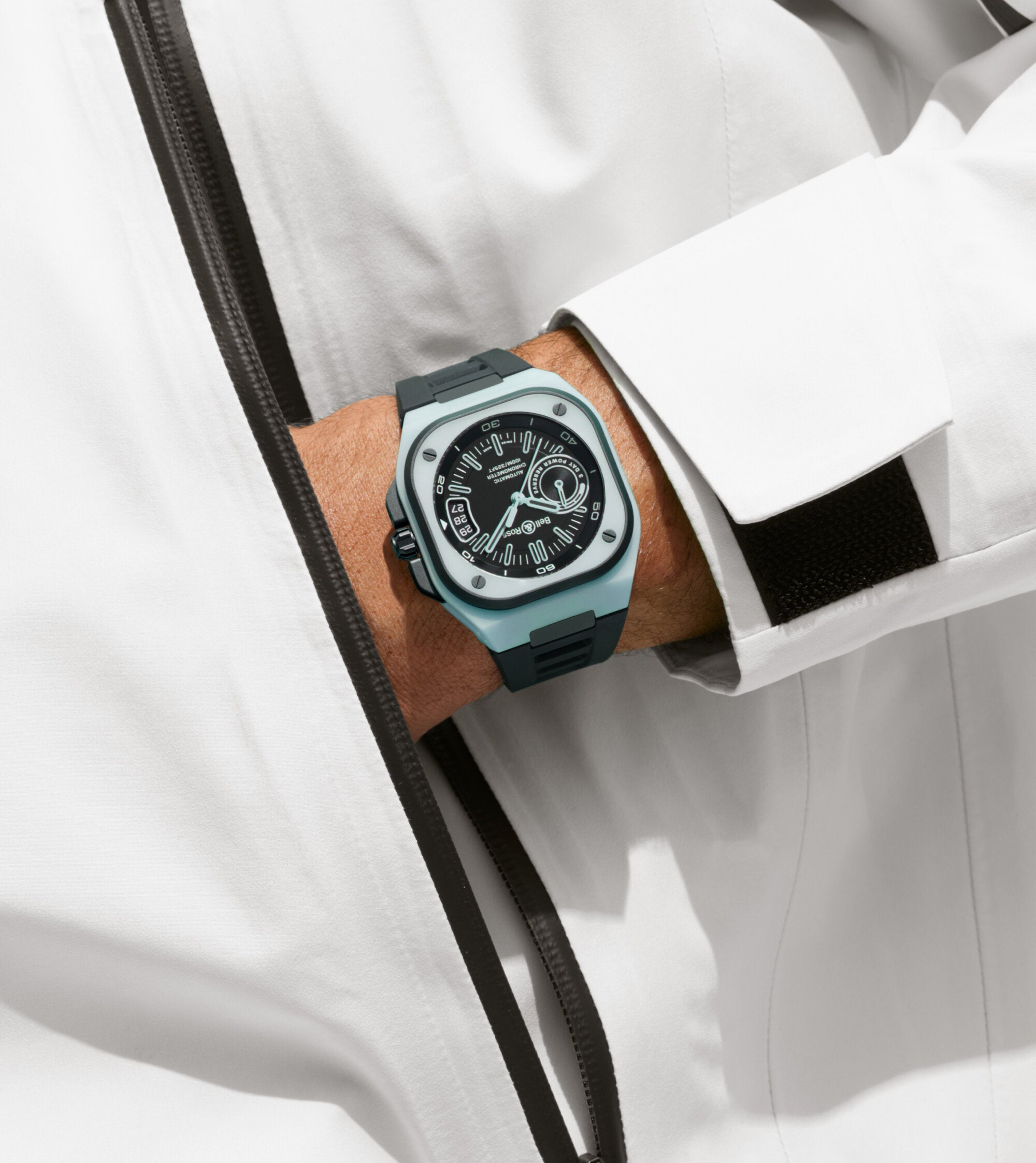 Bell & Ross has developed an innovative luminous material for the BR-X5 Lum: a composite combining epoxy quartz fibre, luminescent material and resin. This material ensures uniform luminosity and is exceptionally lightweight, being 70% lighter than steel. The BR-X5 Blue Lum offers a new colour option with its powerful emissions of blue light.
