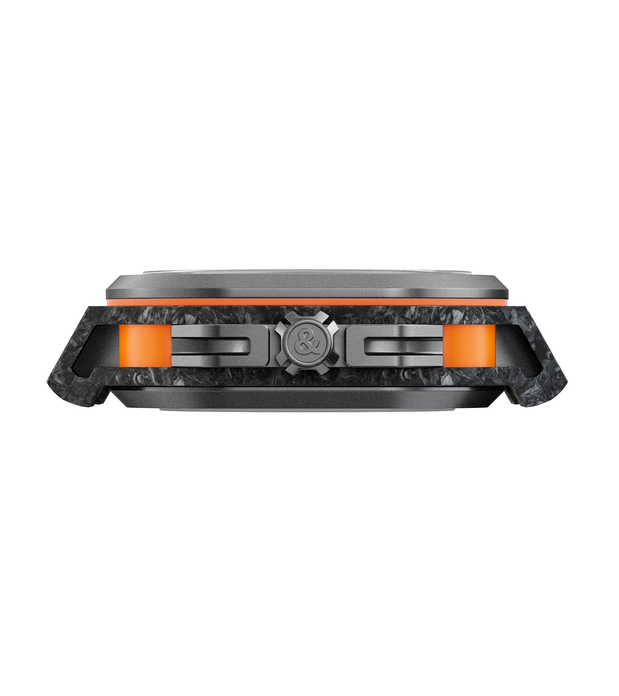 Discreet when viewed from the front, this construction reveals itself when turned on its side. We then discover the elaborate architecture of the middle. The entire 41 mm wide case is airtight by four screws. The lightweight materials, like carbon and titanium, emphasise the high-tech aspects and the high degree of comfort for the wearer, which is further enhanced by the orange rubber strap: fitted with a folding clasp in DLC steel, it is attached to two links independent from the case to ensure perfect ergonomics.