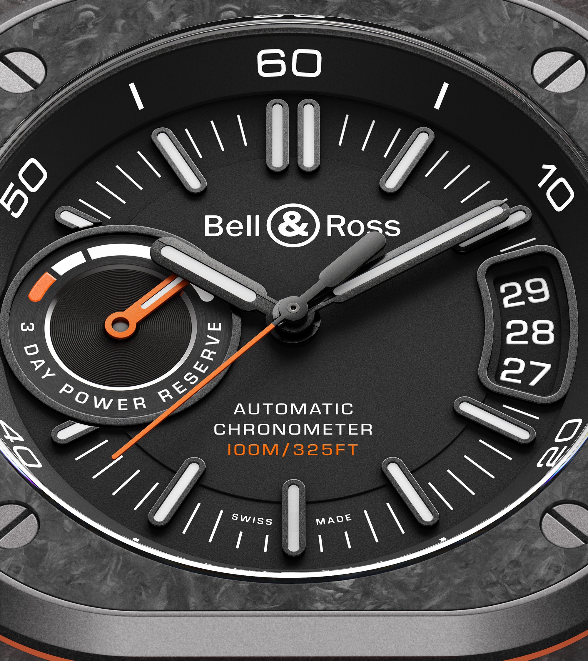 Like the earlier models in steel, the latest BR-X5 Carbon Orange brings together two functions that are particularly useful in everyday life: an oversized vertical date and the power reserve indicator. This double display, which is as legible as it is distinctive, gives the BR-05 family a unique look while making it instantly recognisable when on the wrist.