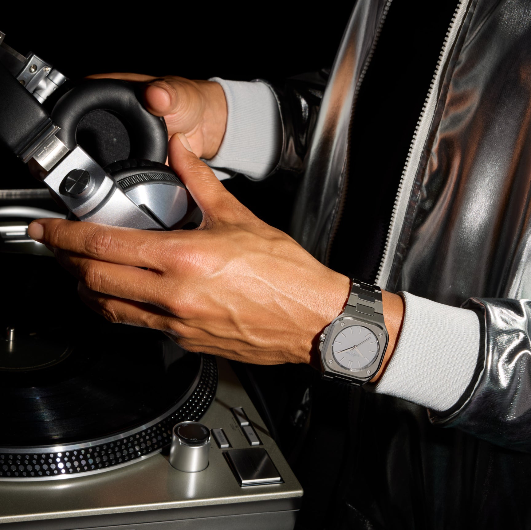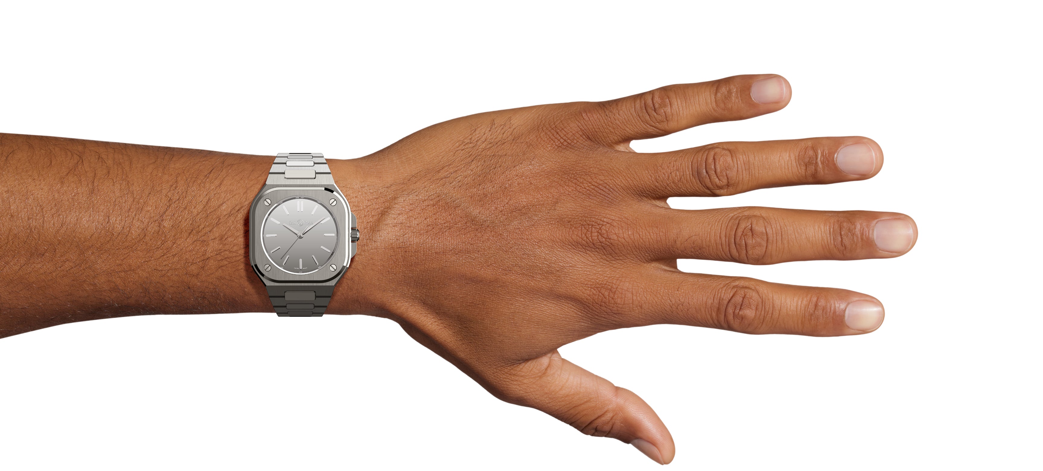 A real mirror with changing reflections, the BR-05 Grey Mirror Steel stands out with its all-metal look, where the dial, indices and flange appear to be carved from a single block of polished steel. Its monochrome, monoblock design, with no date window, embodies an extreme quest for purity and minimalism.