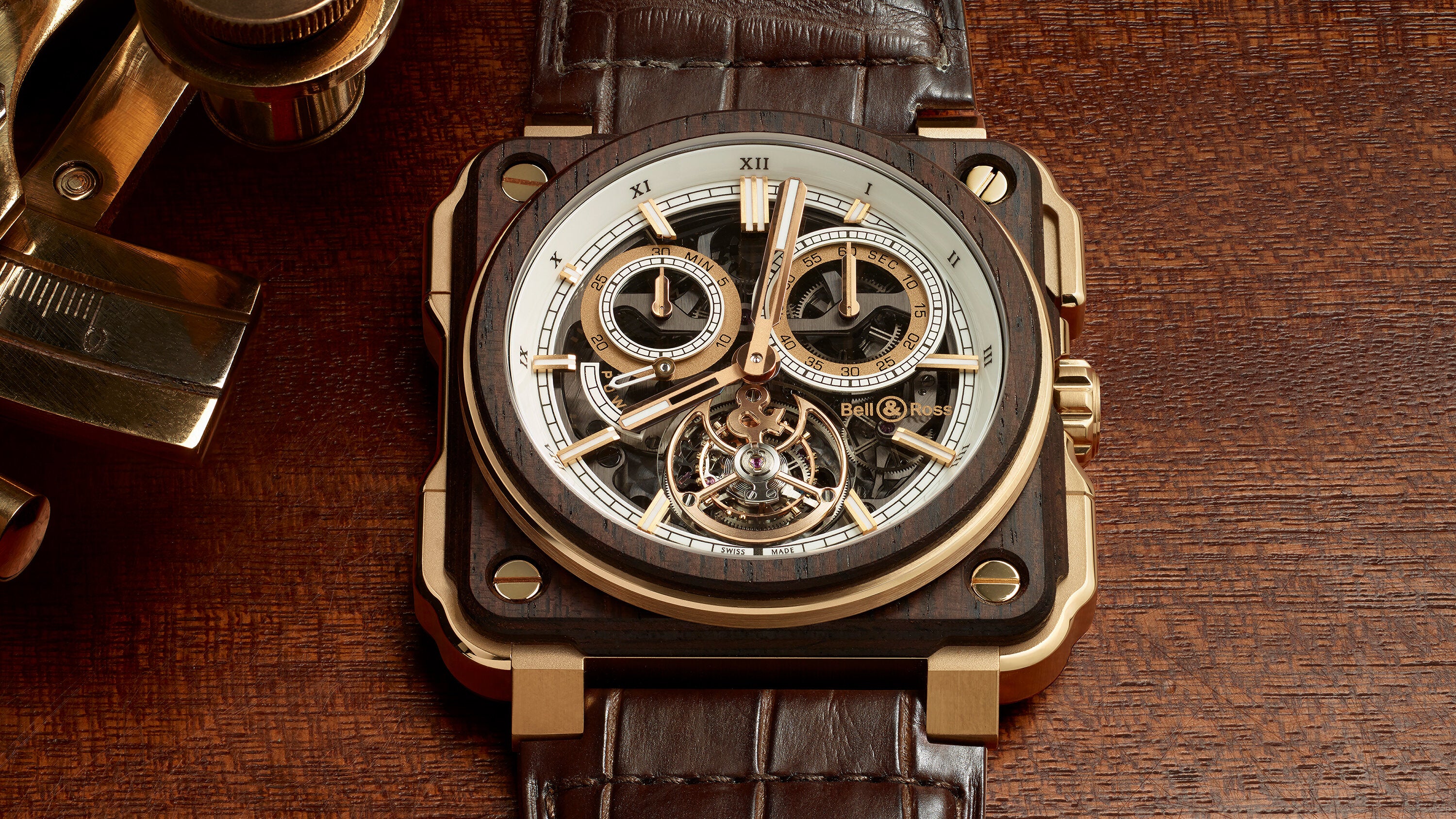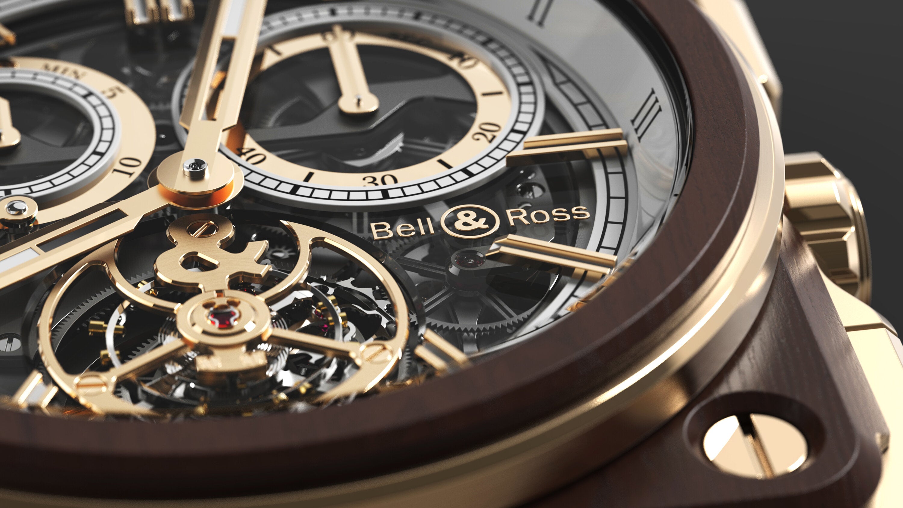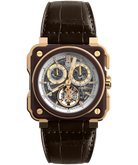 Movement : BR-CAL.283. Hand-wound flying tourbillon. Monopusher column-wheel chronograph. 282 components, 35 jewels, 21,600 vph. 4-day power reserve.