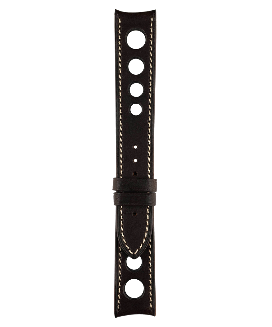 "Aero" perforations. Curved handles. Ecru stitching. Lug width: 20 mm. Buckle width: 18 mm. Buckle sold separately.