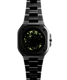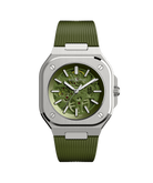 Dial : Skeleton with olive green tinted transparent plate and rhodium-plated movement. Applied indexes filled with Super-LumiNova®. Skeletonized metal hour and minute hands filled with Super-LumiNova®.