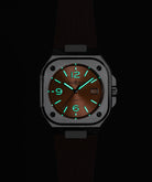 For a sportier feeling, the BR-05 Copper Brown Steel is also available on rubber strap which comes in a colour, specifically developed for it, harmonising perfectly with the light brown of the dial