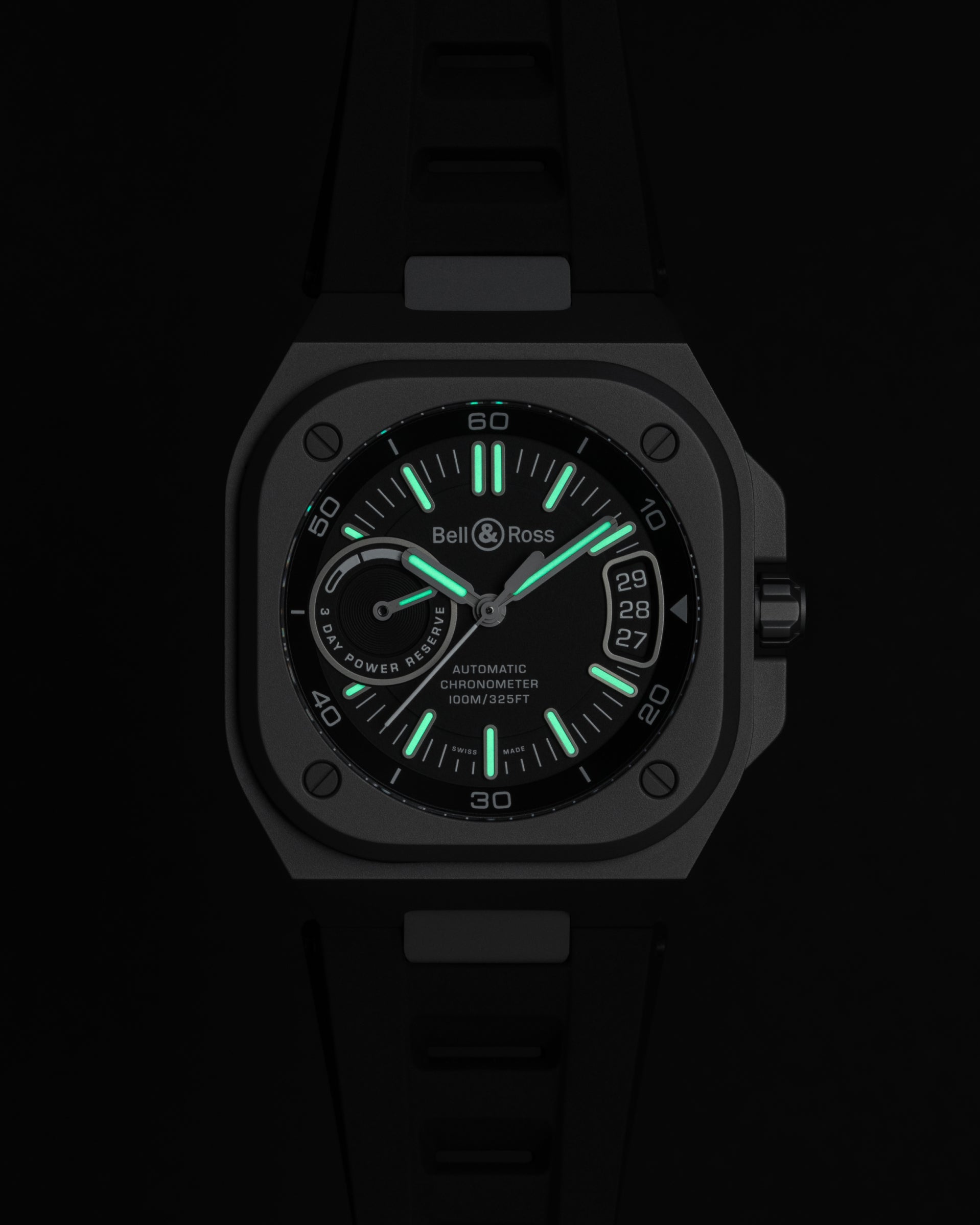 The calibre BR-CAL.323, chronometer-certified by the COSC, can be seen through the tinted crystal in the centre of the dial and the sapphire on the case-back. The 70-hour power reserve indicator, shaped like a fuel gauge, accentuates the sports styling of the BR-X5 Racing.