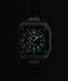 The calibre BR-CAL.323, chronometer-certified by the COSC, can be seen through the tinted crystal in the centre of the dial and the sapphire on the case-back. The 70-hour power reserve indicator, shaped like a fuel gauge, accentuates the sports styling of the BR-X5 Racing.