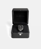 Inspired by the Aero GT supercar and the design of stealth aircraft, the watch dial adopts the codes of racing car instrument panels. It has a central seconds hand with a chequered graduation accurate to the quarter-second, with the minutes on the outer flange and the hours on the crystal of the dial. The hour numerals and hands are luminescent for optimum legibility in the dark.