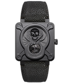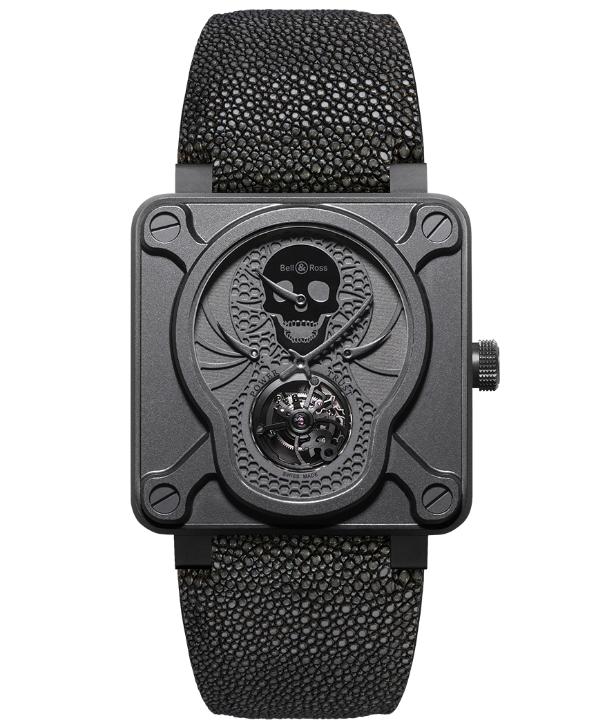 Movement : Hand-wound mechanical. Carbon fiber plates and bridges. Black gold-finished tourbillon cage.