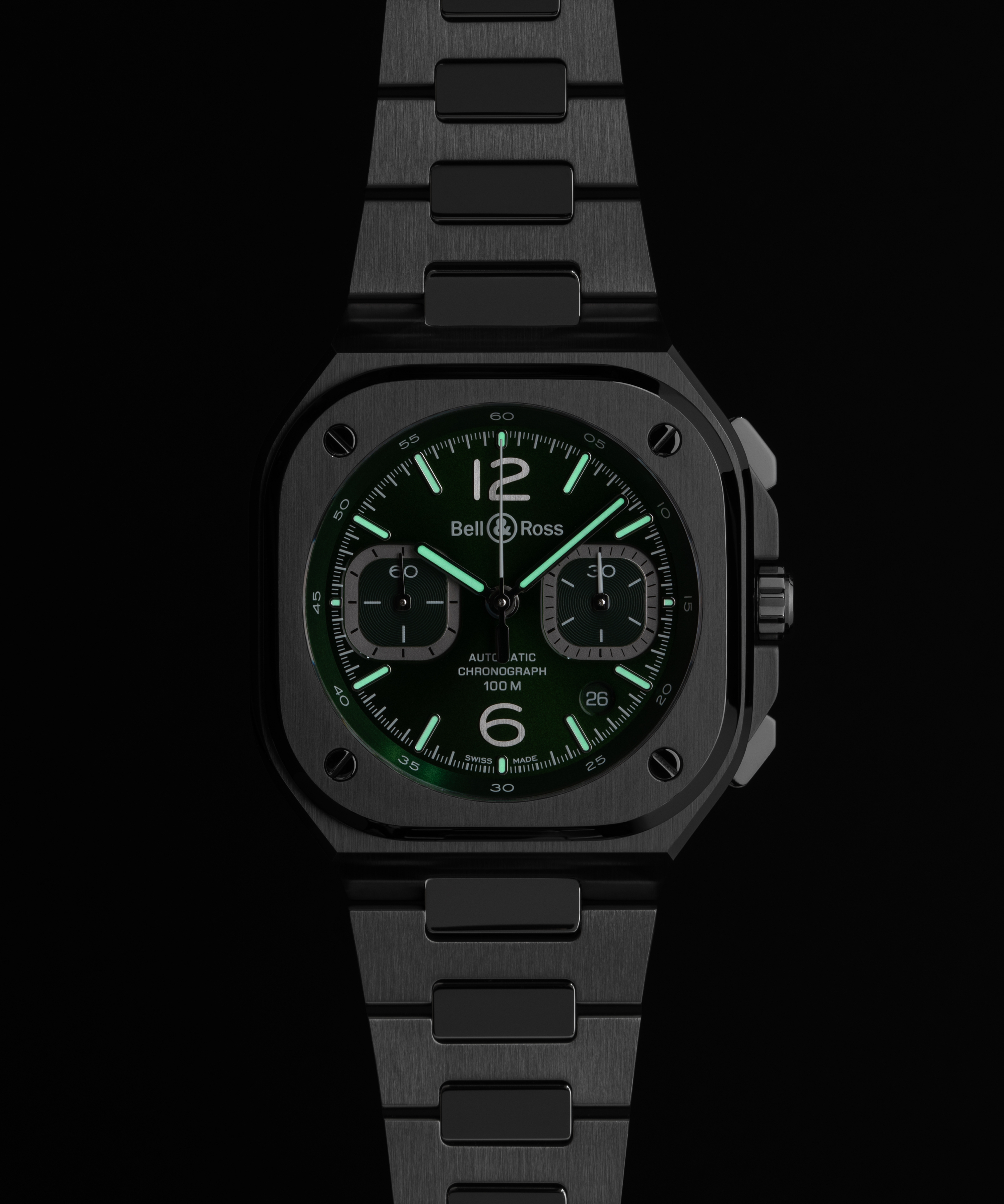 The BR-05 chronograph, a sculptural and seductive, chic and powerful men's jewel from Bell & Ross, comes in a deep green.