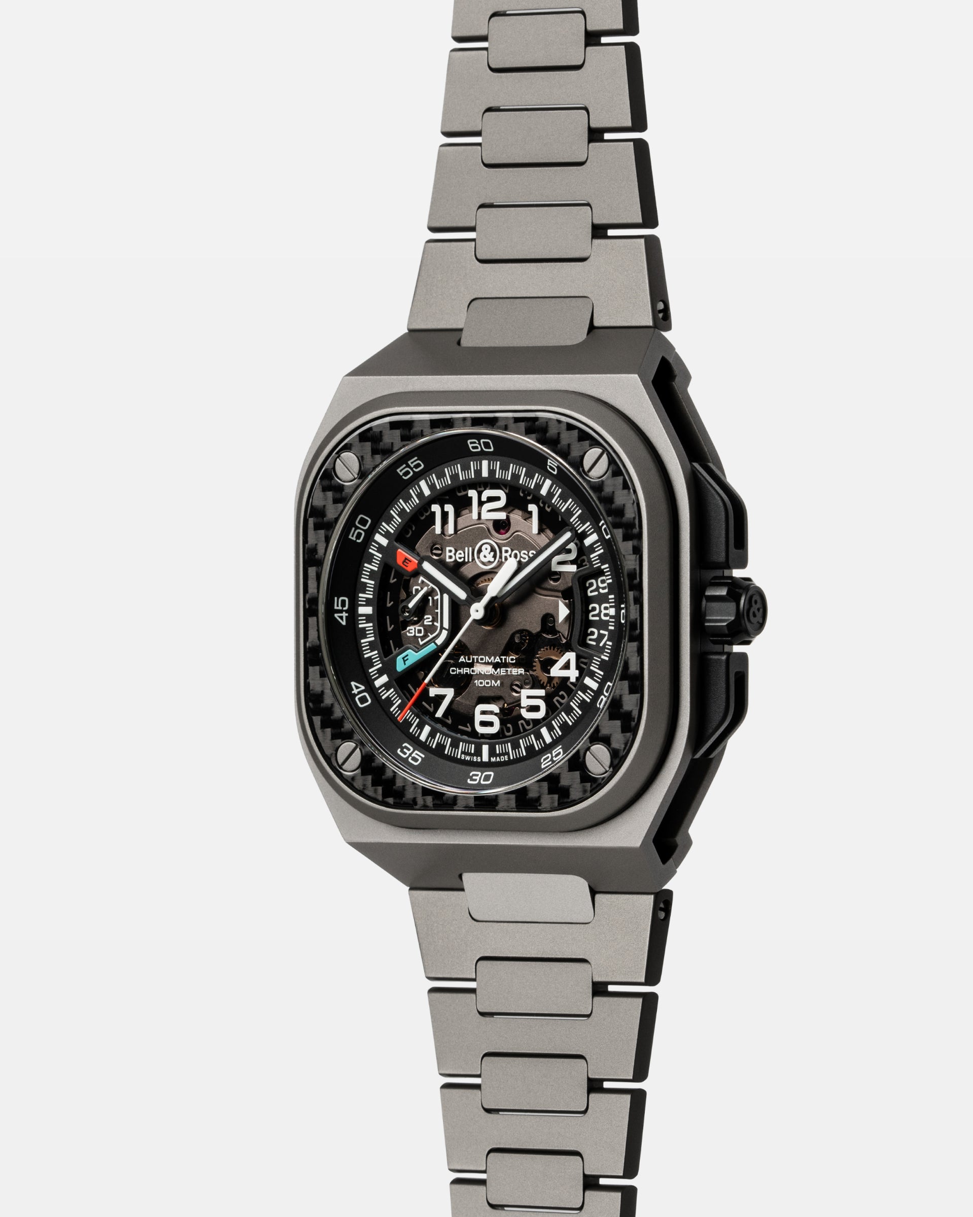 Bell & Ross has opted for titanium, a prized material in aeronautics due to its robustness and lightness, at only one third of the weight of steel. Hypoallergenic, non-corrosive and non-magnetic, titanium delivers both practicality and performance.