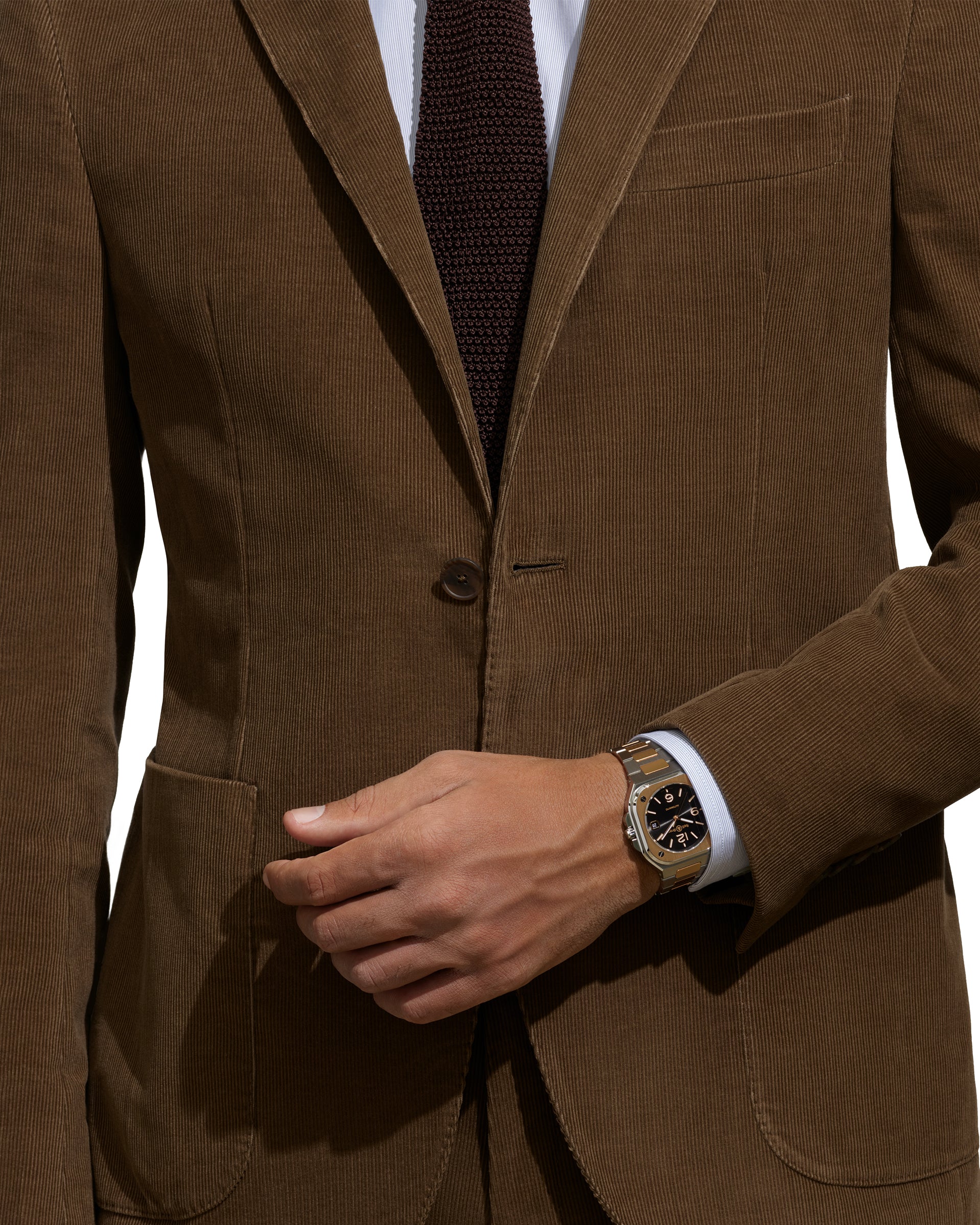 El BR-05 Artline Steel & Gold se distingue por sus detalles en oro, como el bisel fijado y los eslabones de la pulsera adornados con estrías en relieve. Estos elementos añaden un toque único al reloj, al tiempo que conservan las características distintivas de la línea BR-05, como su bisel cuadrado de una sola pieza.
