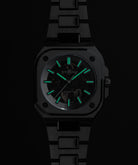 El BR-05 Skeleton Phantom Ceramic adopta una estética furtiva, completamente en negro. Su esfera de zafiro tintado revela en transparencia el movimiento esqueletizado rodiado. Los índices y las agujas están rellenos de Super-LumiNova® negra, que emite una luz verde en la oscuridad. Este juego de contrastes técnicos y estéticos es complementado con un segundero rodiado. Un reloj pensado para la acción, conforme a los estándares de legibilidad de Bell & Ross.