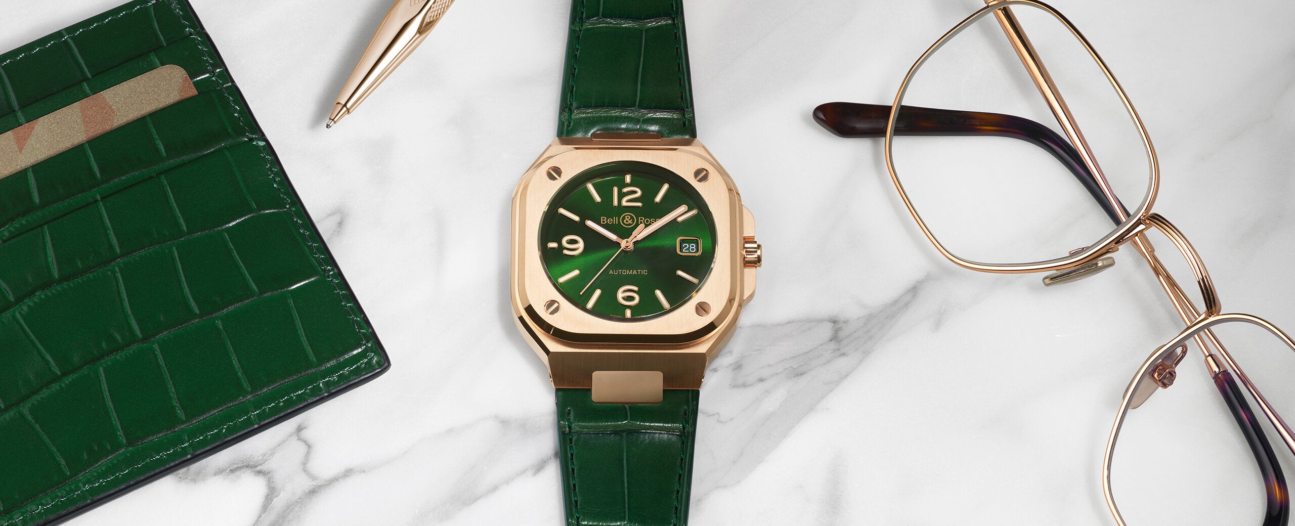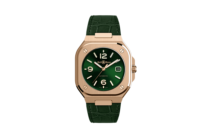 El BR-05 Green Gold es el tercer eslabón de la familia Gold, su caja y brazalete están fabricados íntegramente en oro. En la nueva esfera del BR-05 Green Gold el tono verde adquiere una tonalidad luminosa y chispeante. La placa de metal pintado que sirve de base a la esfera tiene un efecto sol, que cambia de color cuando se inclina. La profundidad de este color único se obtiene gracias a las numerosas capas de barniz verde tintado.
