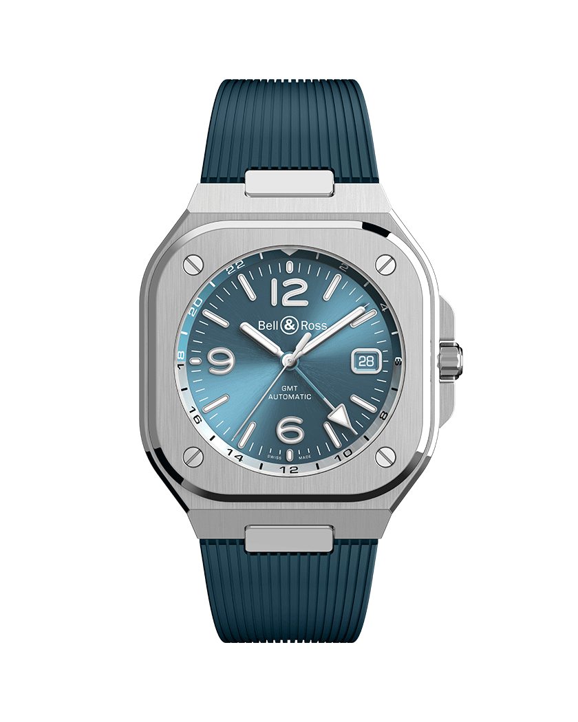 La BR-05 GMT Sky Blue, au cadran bleu soleillé, propose un affichage clair et simple d’un deuxième fuseau horaire grâce à une quatrième aiguille.