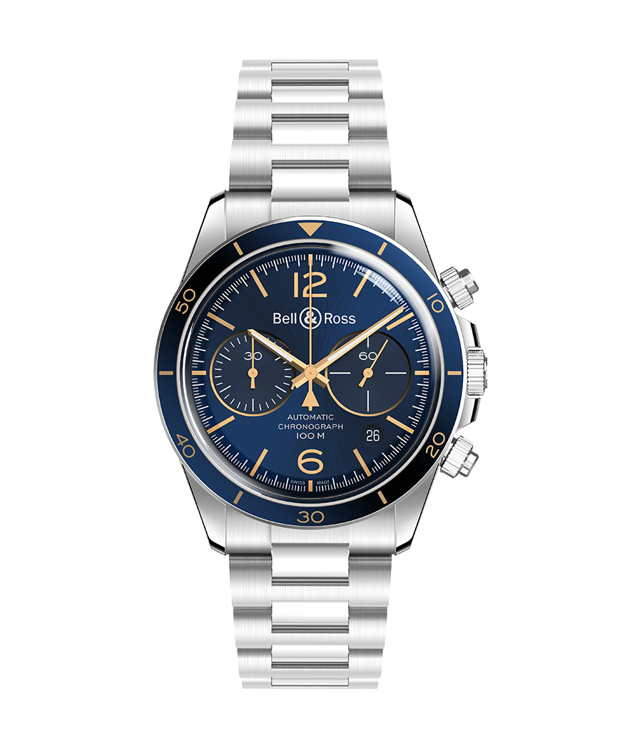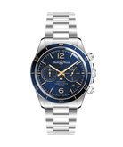 Fonctions : Heures, minutes, petite seconde à 3h et date. Chronographe : compteur 30 min à 9h, seconde du chronographe au centre.