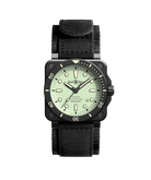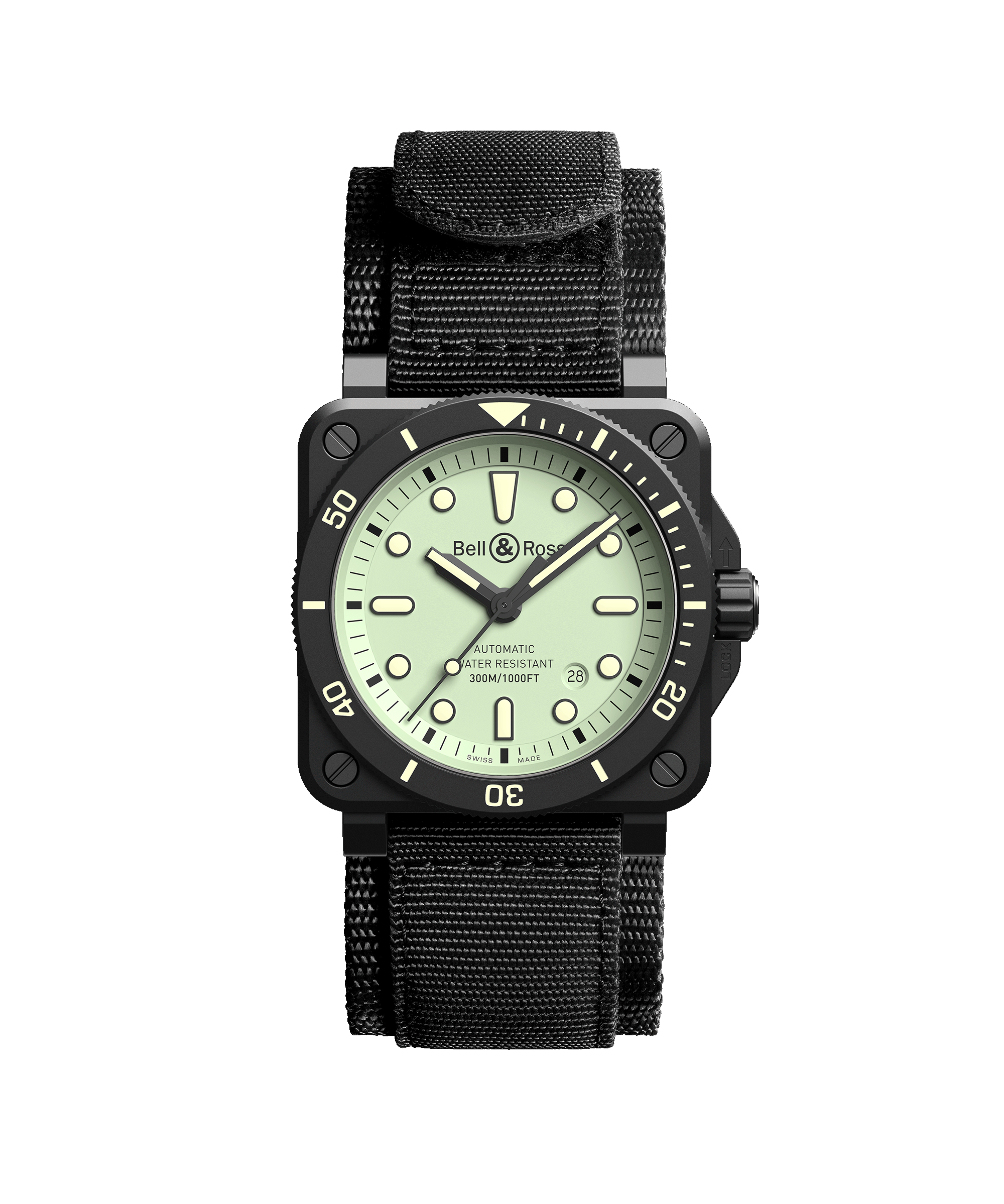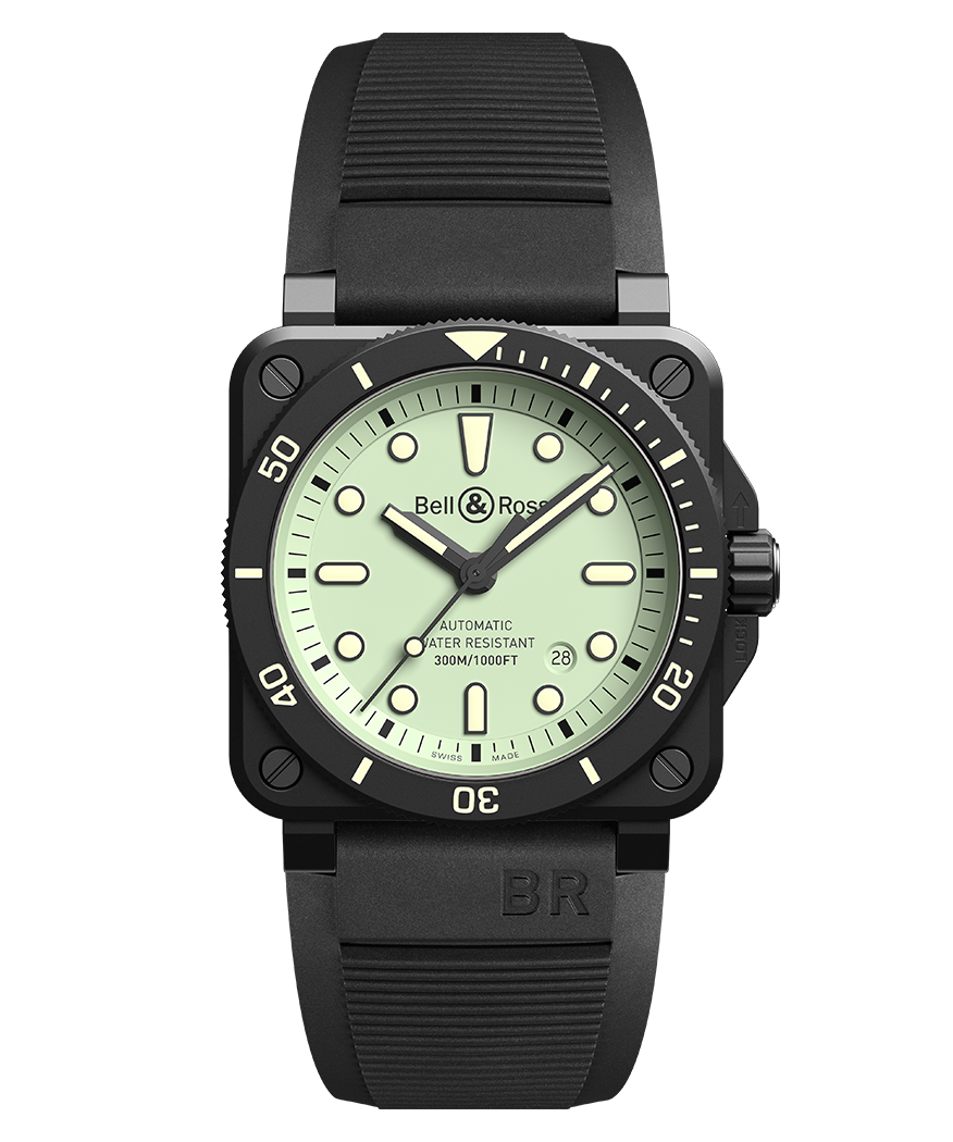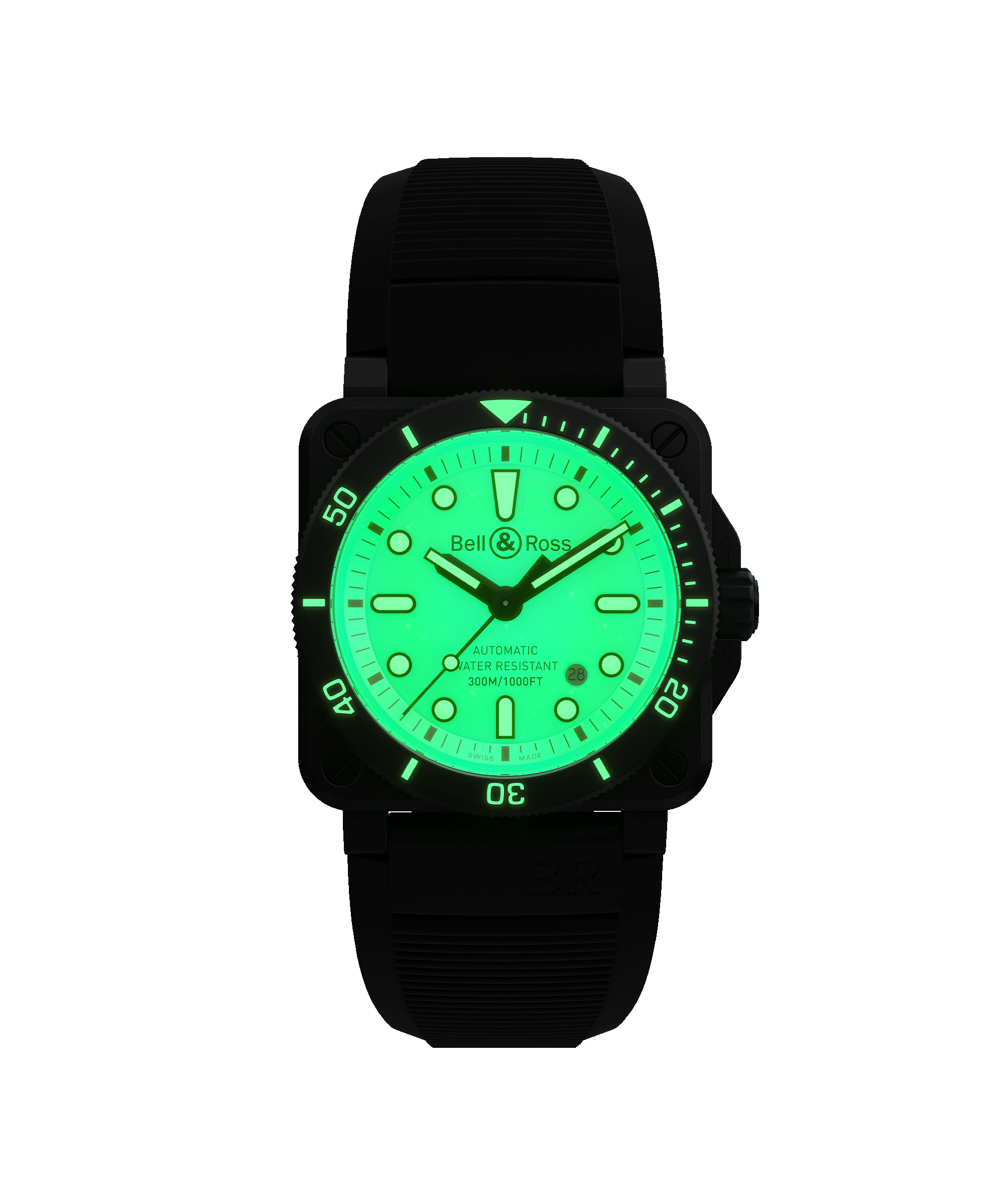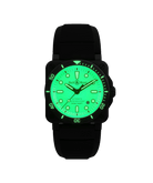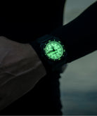 Quadrante : Verde luminescente con trattamento Super-LumiNova®. Indici e lancette di metallo applicati scheletrati riempiti di Super-LumiNova®.