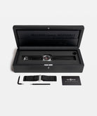Cinturino : Pelle di vitello di colore nero con marcatura a caldo e tela sintetica ultraresistente nera.