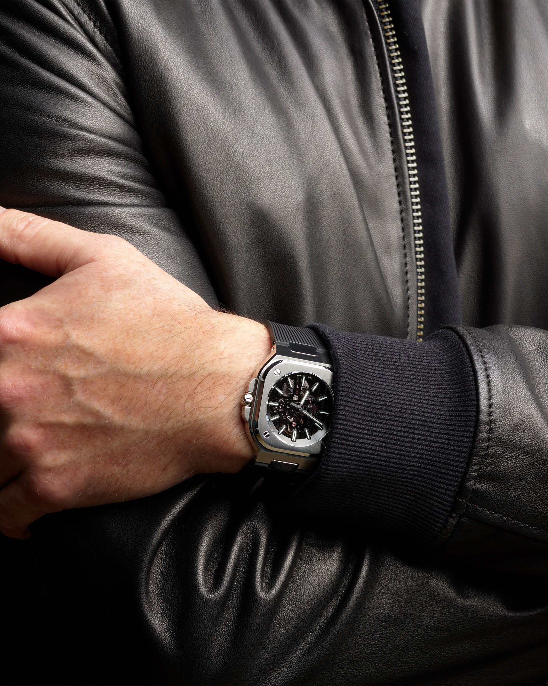 BR-05 Skeleton Arctic Blue의 다이얼은 얼음 평원에서 발견되는 균열을 충실히 모방한 불규칙한 선을 레이저로 각인한 블루 글래스 플레이트가 특징입니다. 균열의 경로를 표시하는 서리처럼 패드 인쇄를 통해 화이트 전사를 적용했습니다.